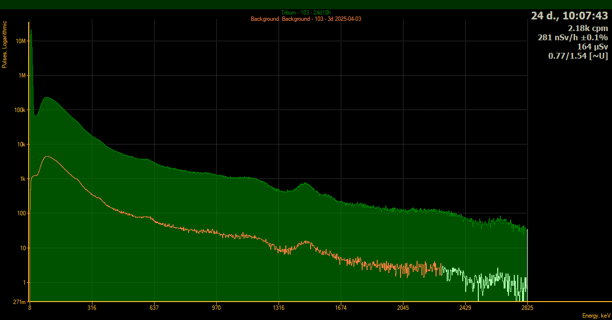 Here is a 24 day, 10 hour long accumulation from a glow in the dark Tritium tube, vial, thing. It's just like the ones used in fishing indicators, clocks, watches and military defile markers. Often called 'beta lights'. Total counts: 76,669,829