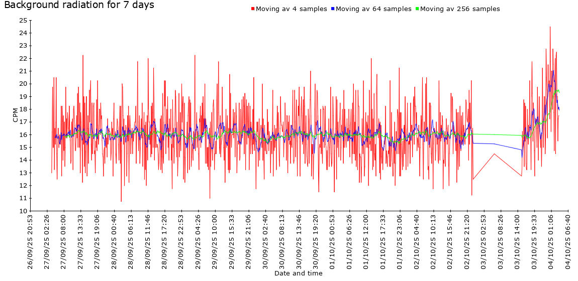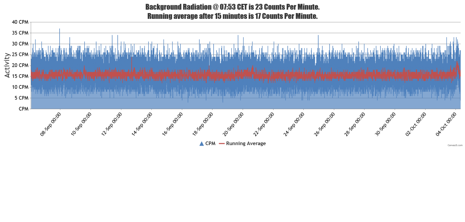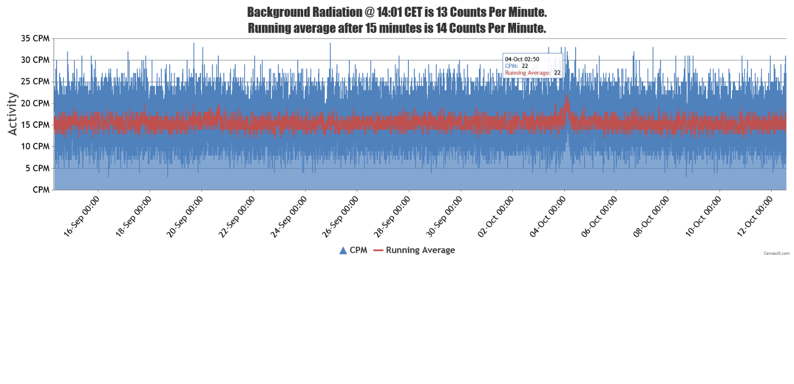 Normally my measurements are around 15 CPM. My running average is always around that number as well. But last night between 01:30 and 03:30 CET I saw a spike in the running average up to 22 CPM. That doesn’t seem like much, but my station is very stable throughout the year, so it stood out to me. I believe I also noticed an increase during the night at other stations in the Netherlands. According to the Windy app, at that time the wind was coming from the south (via France and Belgium).Has anybody else seen anything similar this night