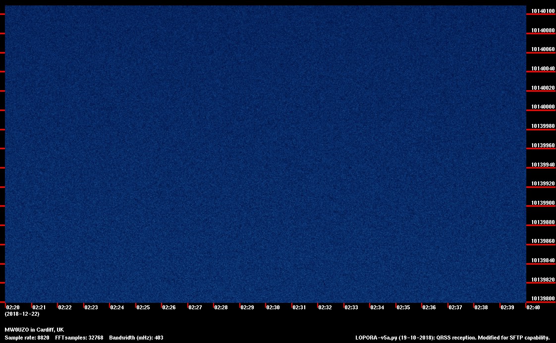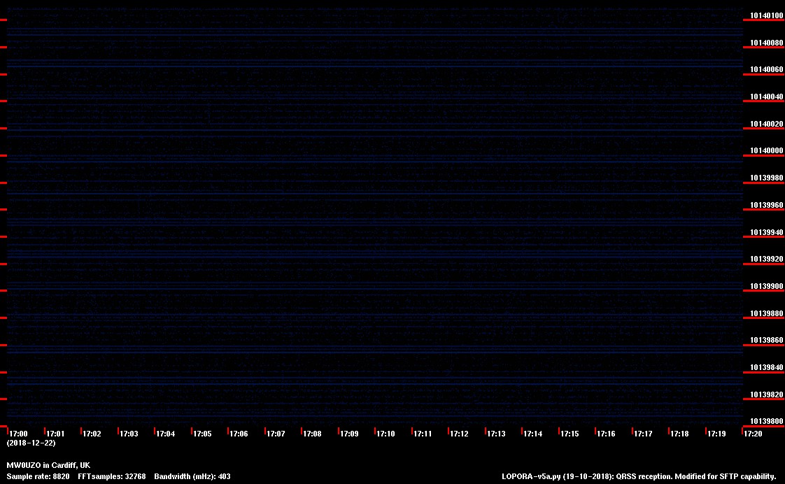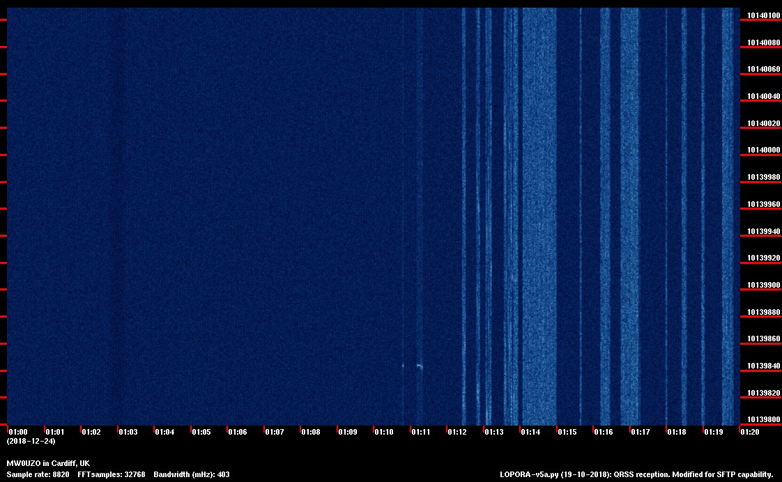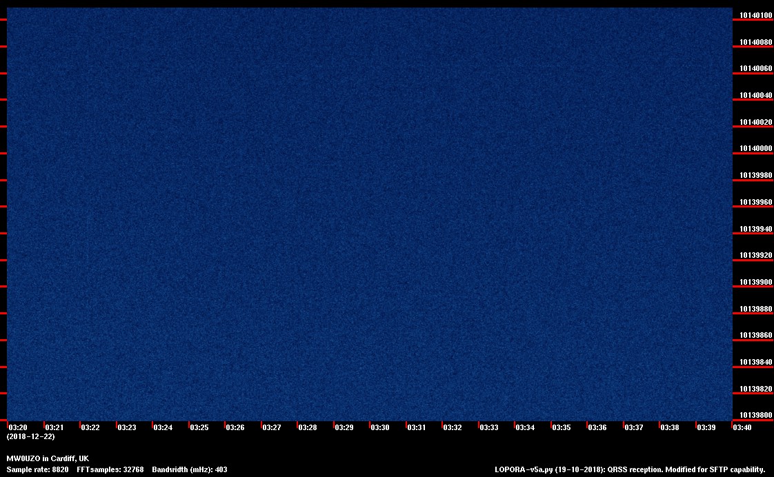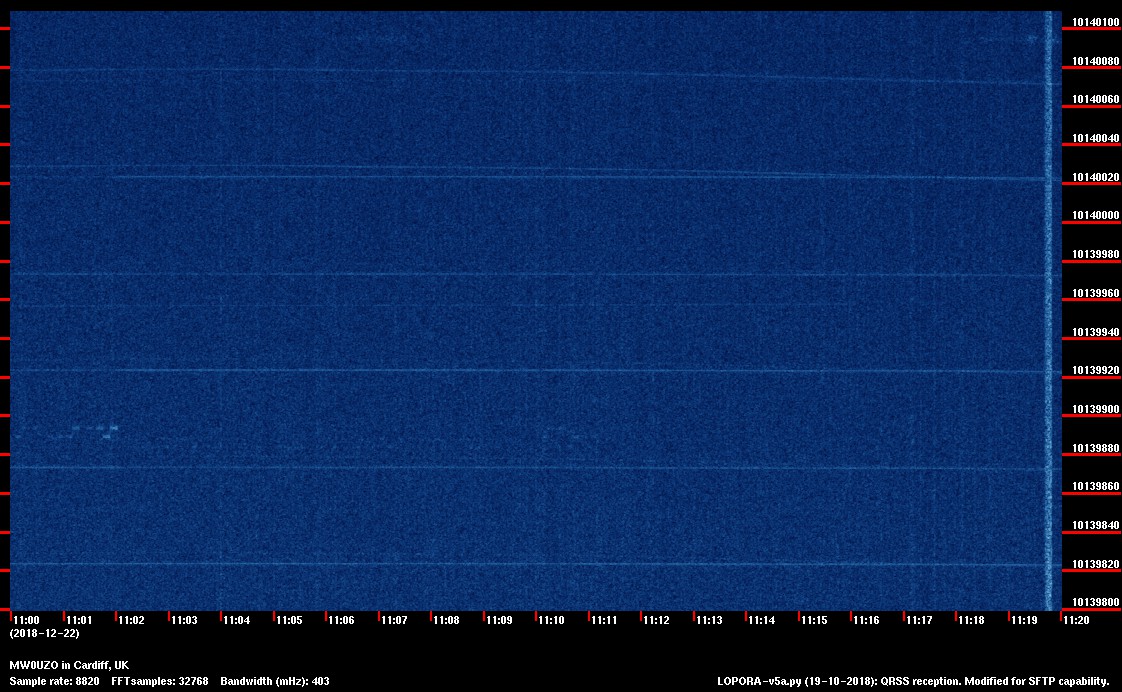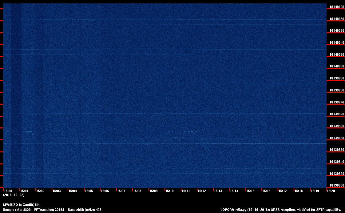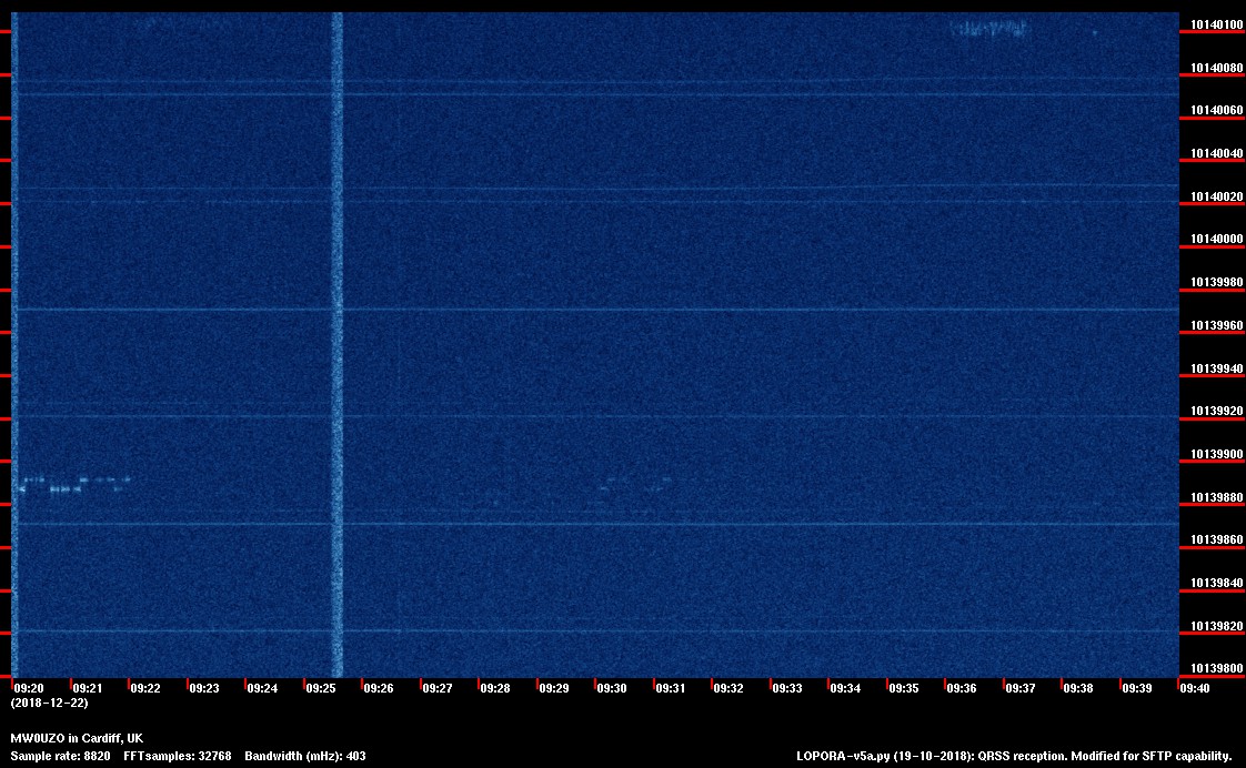 The grabber is made from a simple SDR kit, the Soft66Lite, a Behringer UCA202 USB sound card. The SDR receiver is SDR# and the FFT processing and display software is PA2OHH's excellent analysis program LOPORA. The SDR radio has a crystal frequency of 20.250Mhz with a piece of copper soldered to it, inside a homebrew crystal oven.