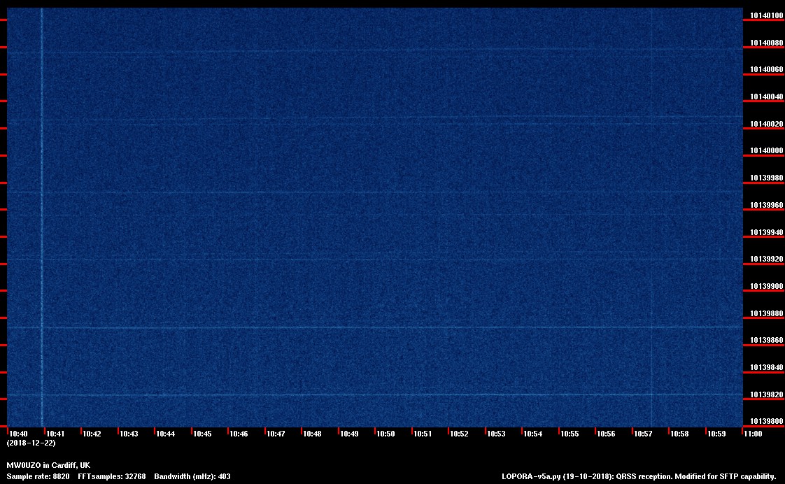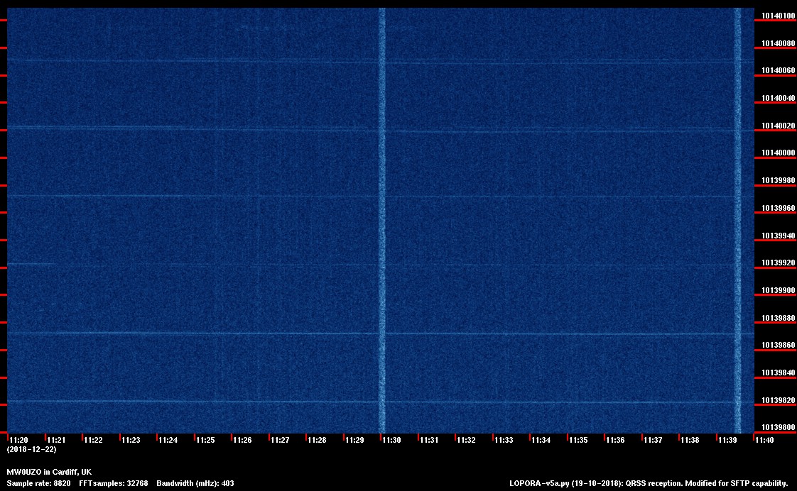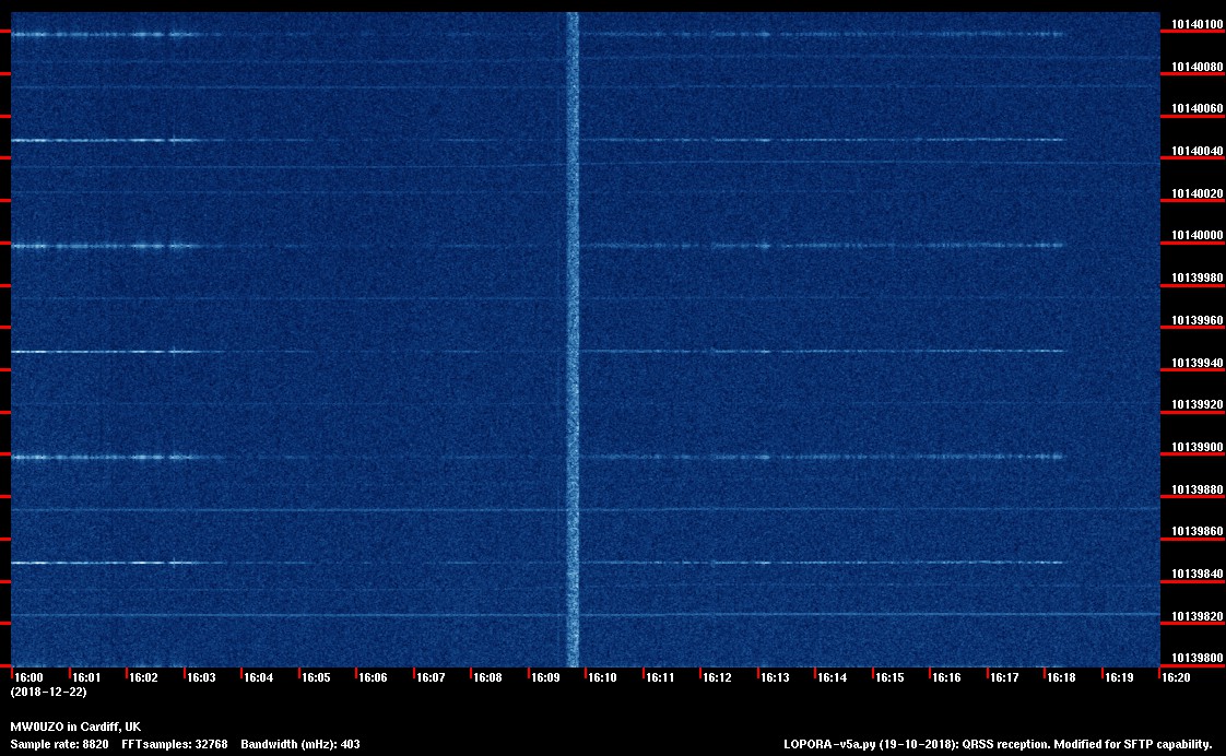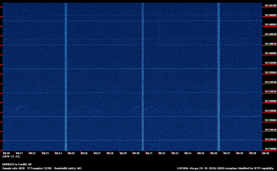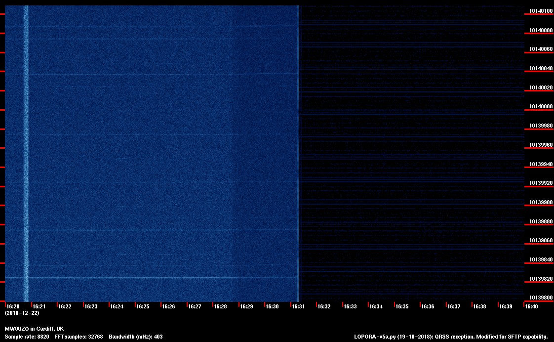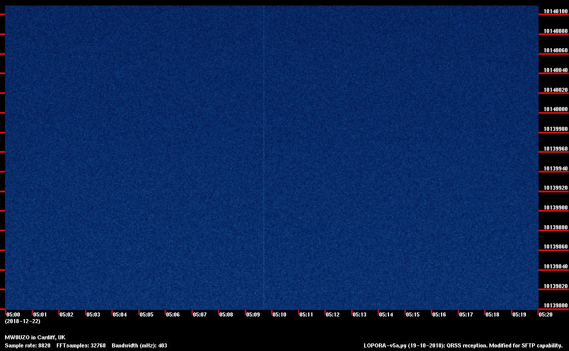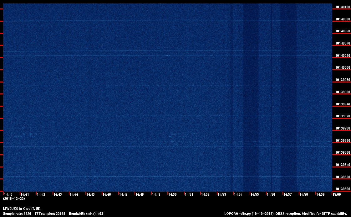 The grabber is made from a simple SDR kit, the Soft66Lite, a Behringer UCA202 USB sound card. The SDR receiver is SDR# and the FFT processing and display software is PA2OHH's excellent analysis program LOPORA. The SDR radio has a crystal frequency of 20.250Mhz with a piece of copper soldered to it, inside a homebrew crystal oven.