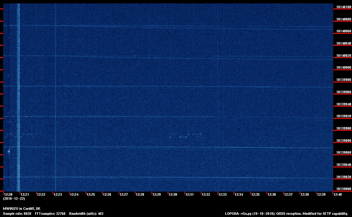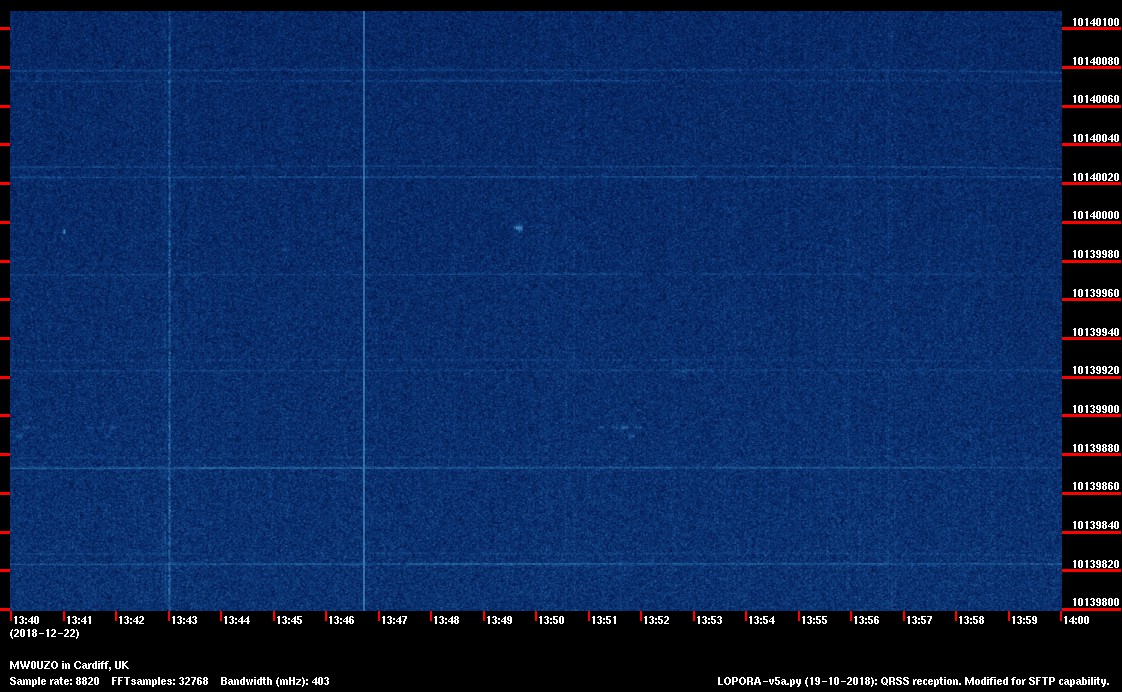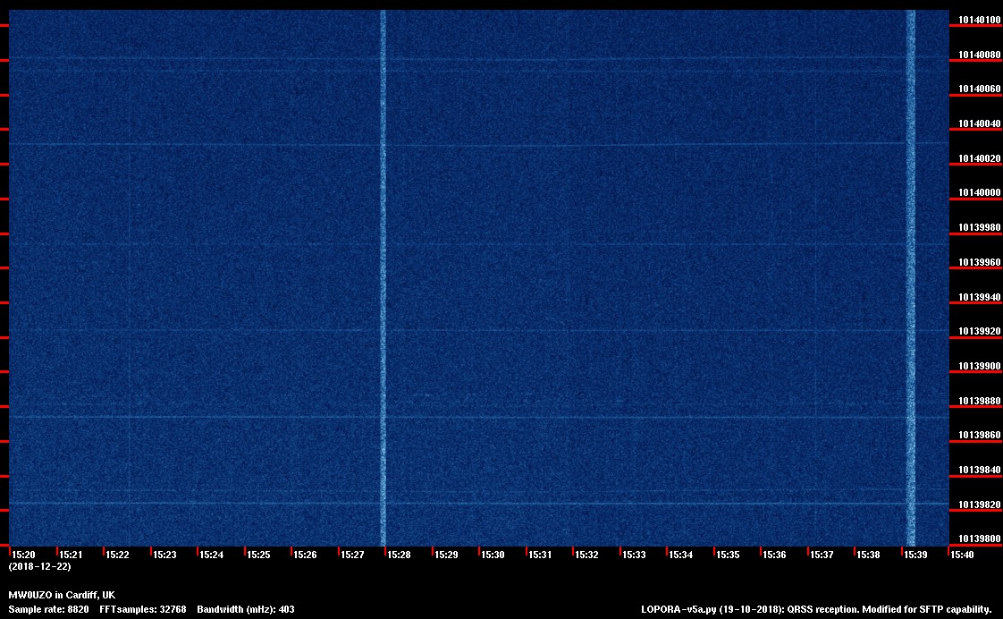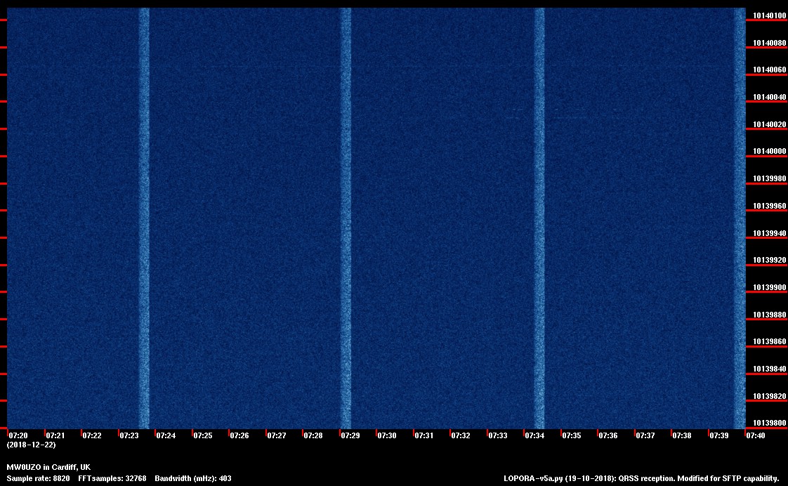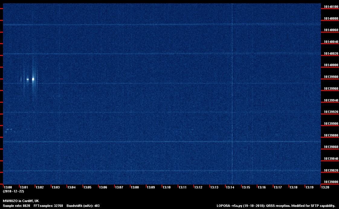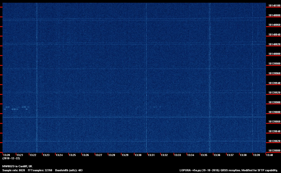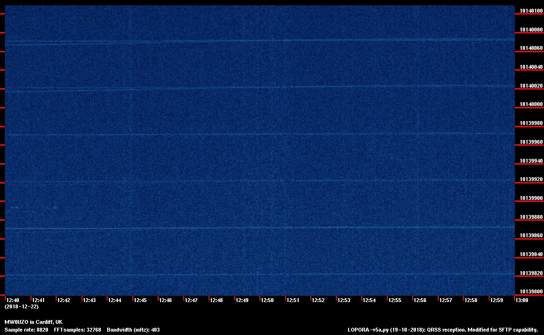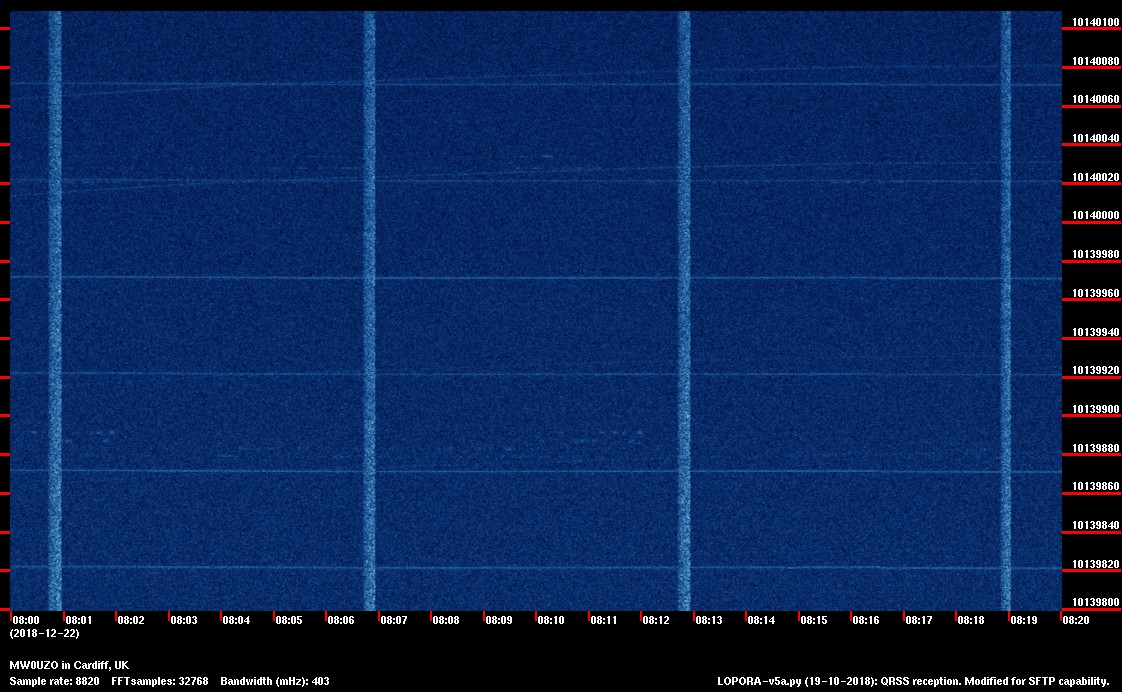 The grabber is made from a simple SDR kit, the Soft66Lite, a Behringer UCA202 USB sound card. The SDR receiver is SDR# and the FFT processing and display software is PA2OHH's excellent analysis program LOPORA. The SDR radio has a crystal frequency of 20.250Mhz with a piece of copper soldered to it, inside a homebrew crystal oven.