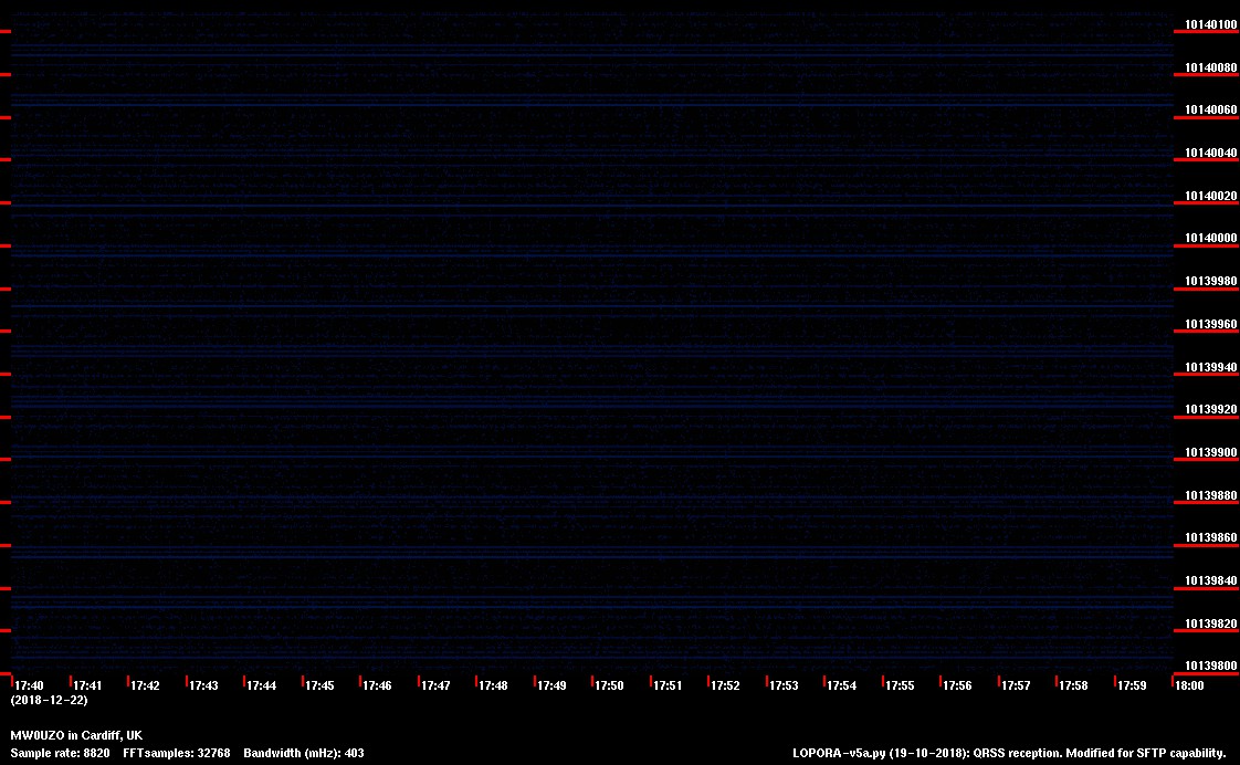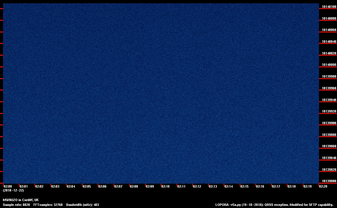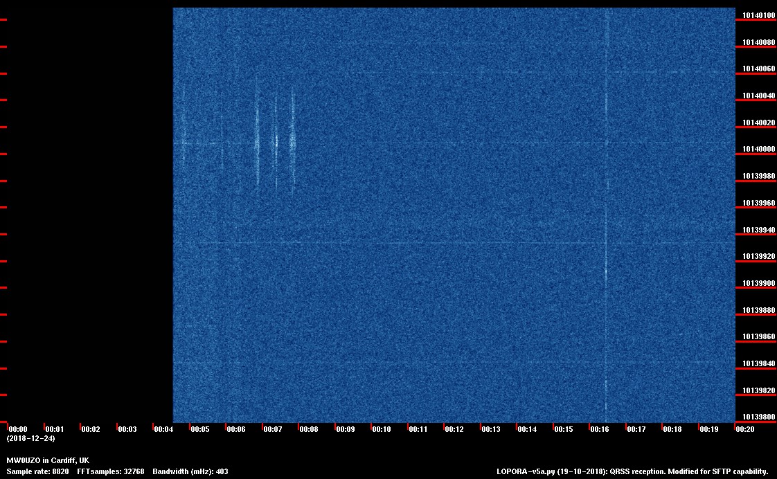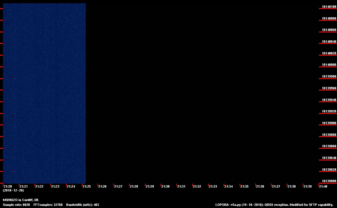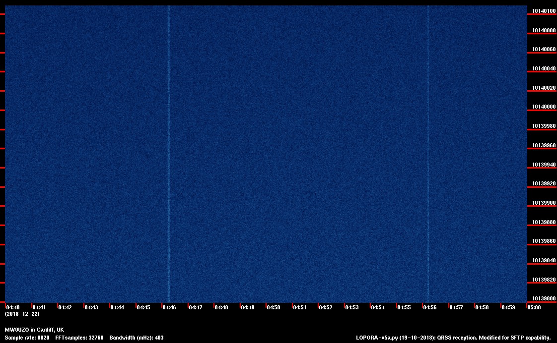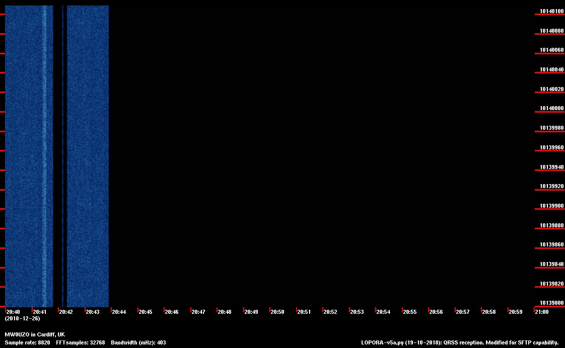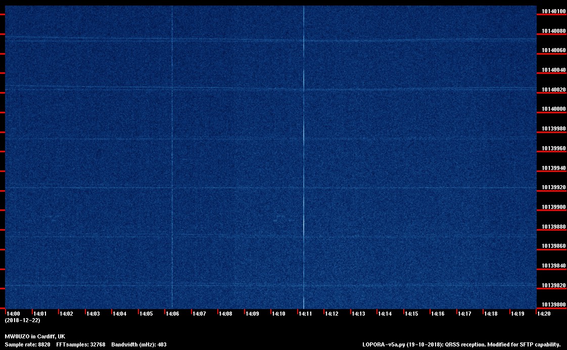 The grabber is made from a simple SDR kit, the Soft66Lite, a Behringer UCA202 USB sound card. The SDR receiver is SDR# and the FFT processing and display software is PA2OHH's excellent analysis program LOPORA. The SDR radio has a crystal frequency of 20.250Mhz with a piece of copper soldered to it, inside a homebrew crystal oven.