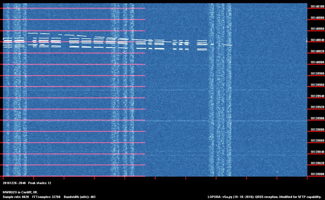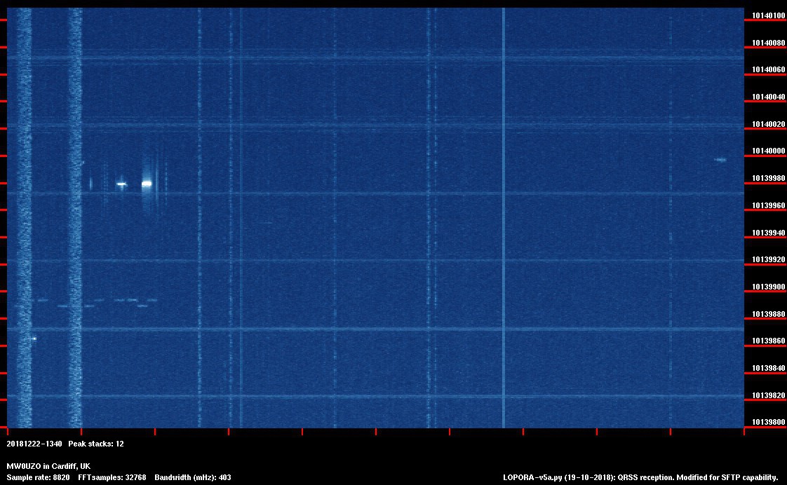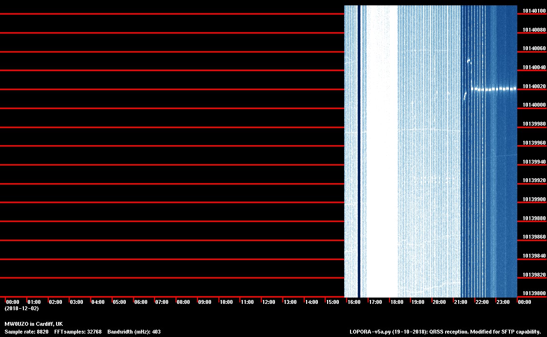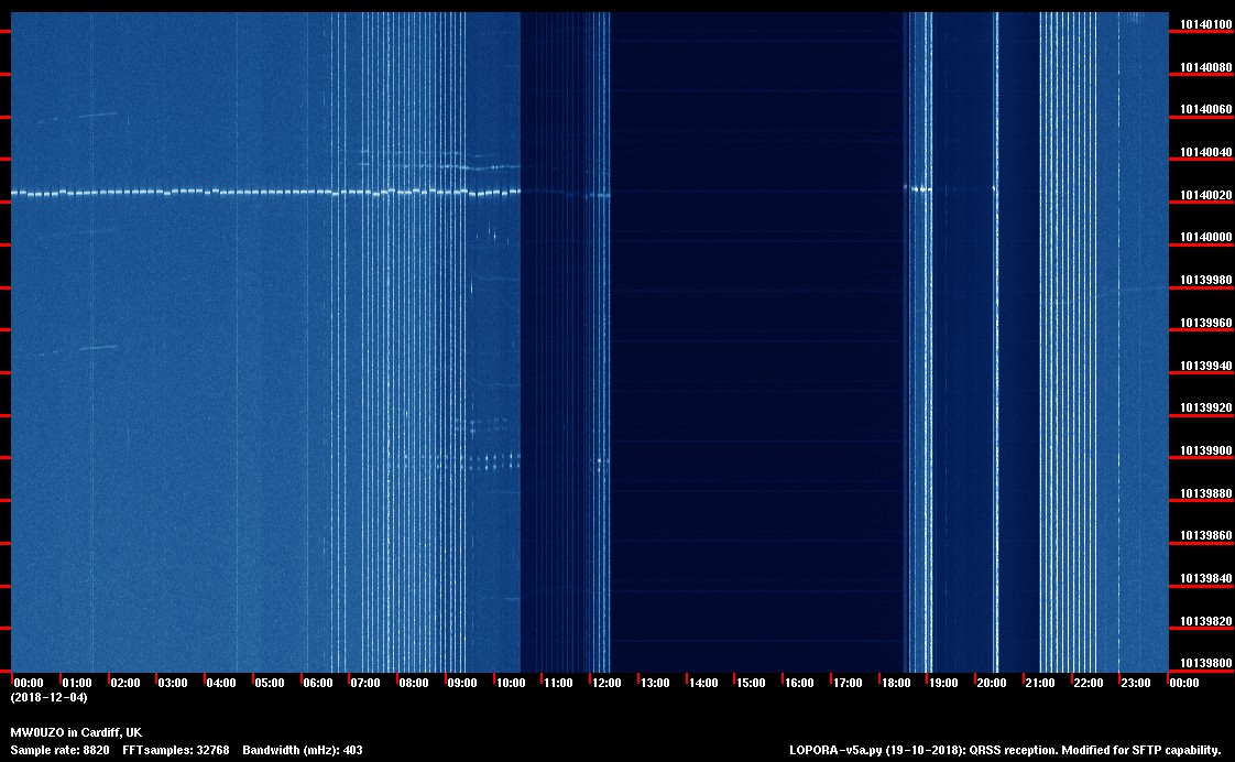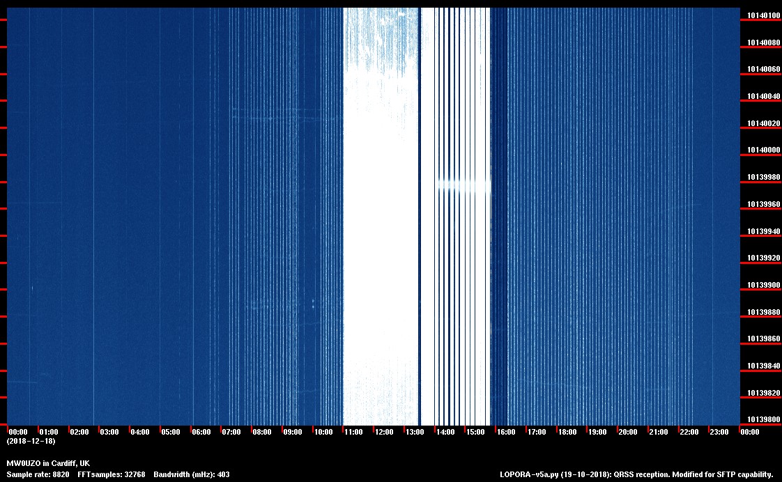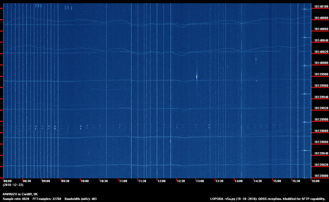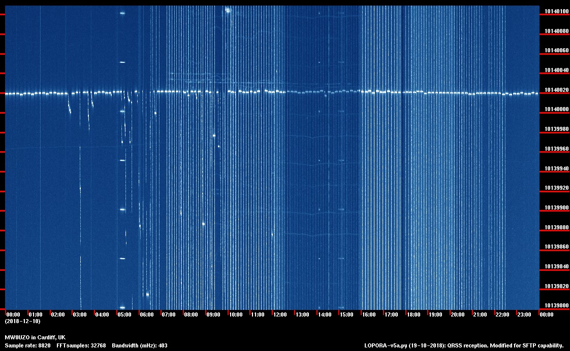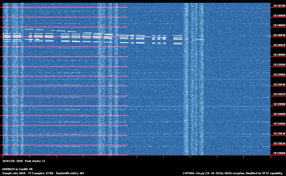 The grabber is made from a simple SDR kit, the Soft66Lite, a Behringer UCA202 USB sound card. The SDR receiver is SDR# and the FFT processing and display software is PA2OHH's excellent analysis program LOPORA. The SDR radio has a crystal frequency of 20.250Mhz with a piece of copper soldered to it, inside a homebrew crystal oven.