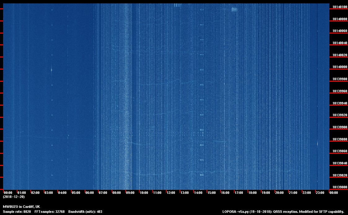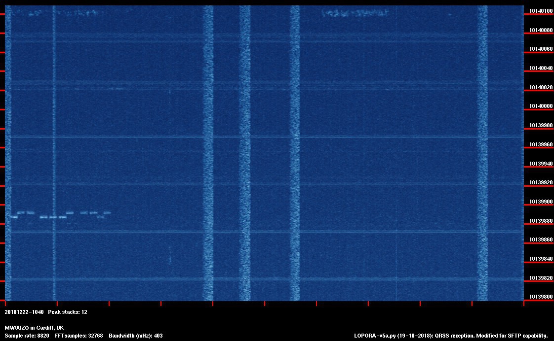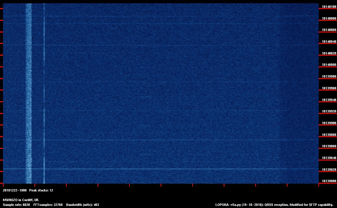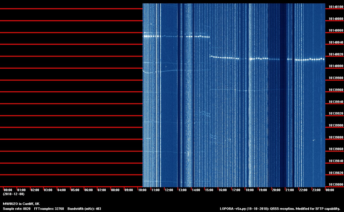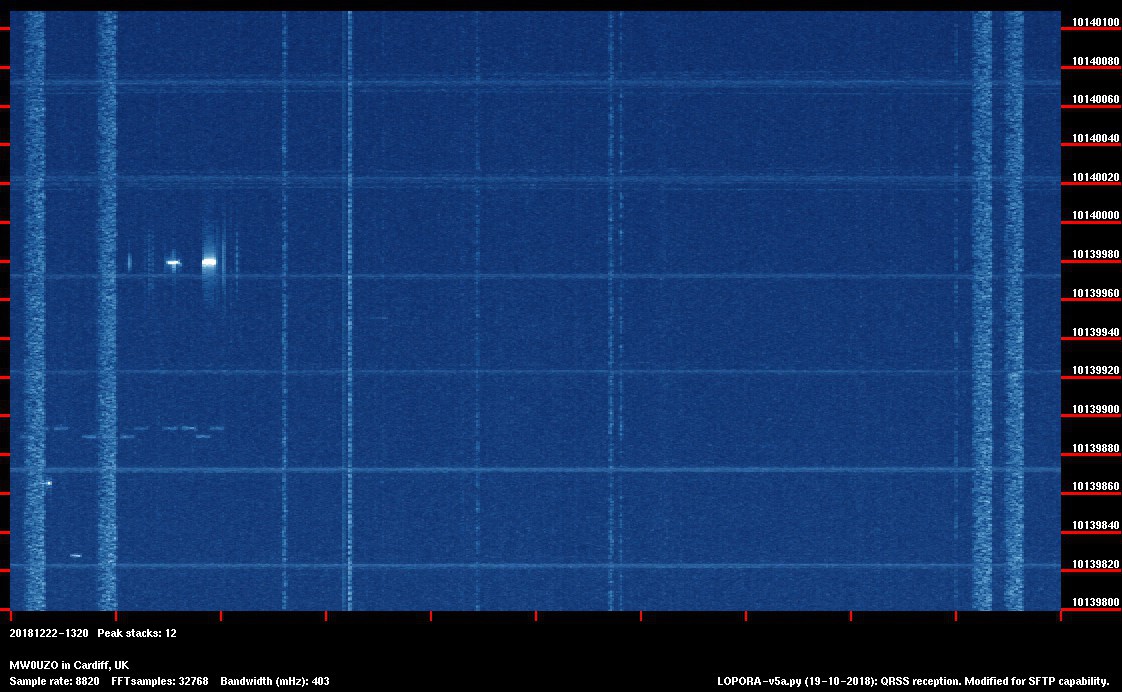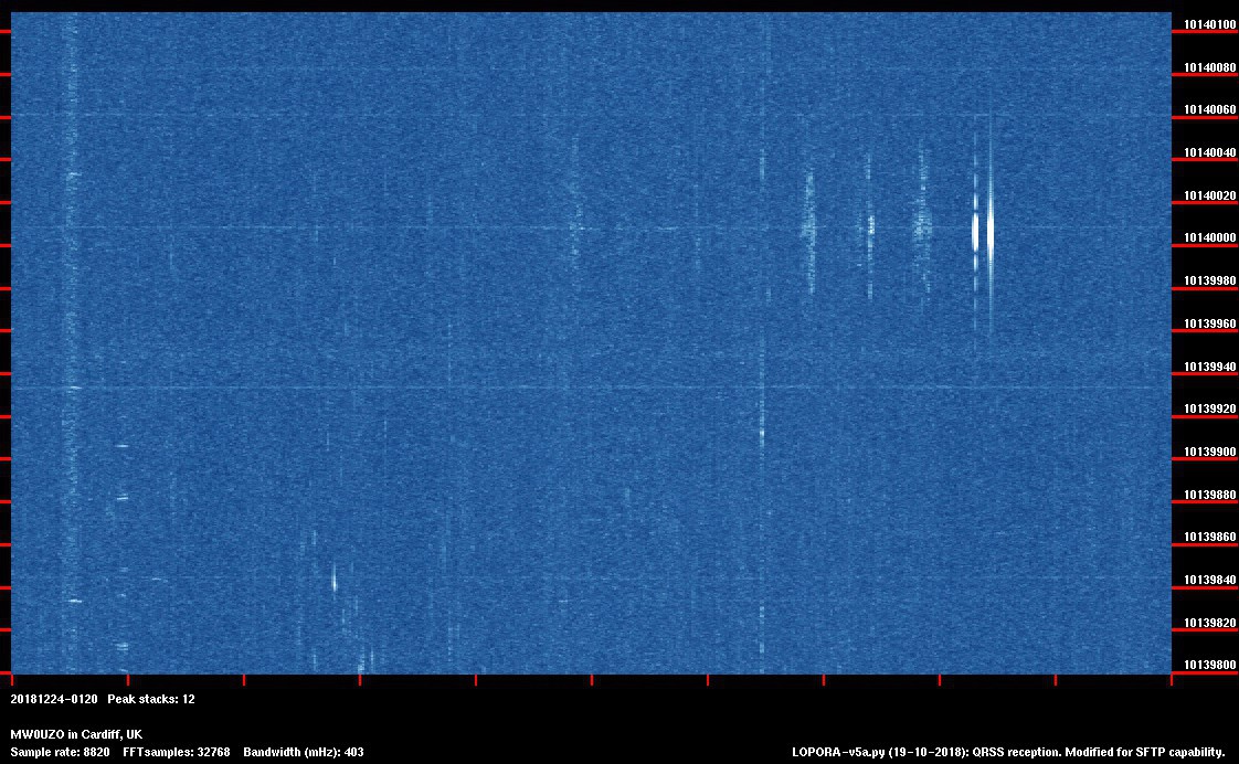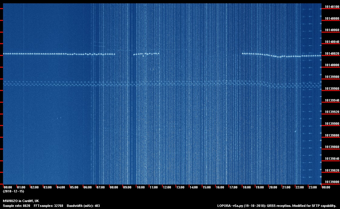 The grabber is made from a simple SDR kit, the Soft66Lite, a Behringer UCA202 USB sound card. The SDR receiver is SDR# and the FFT processing and display software is PA2OHH's excellent analysis program LOPORA. The SDR radio has a crystal frequency of 20.250Mhz with a piece of copper soldered to it, inside a homebrew crystal oven.