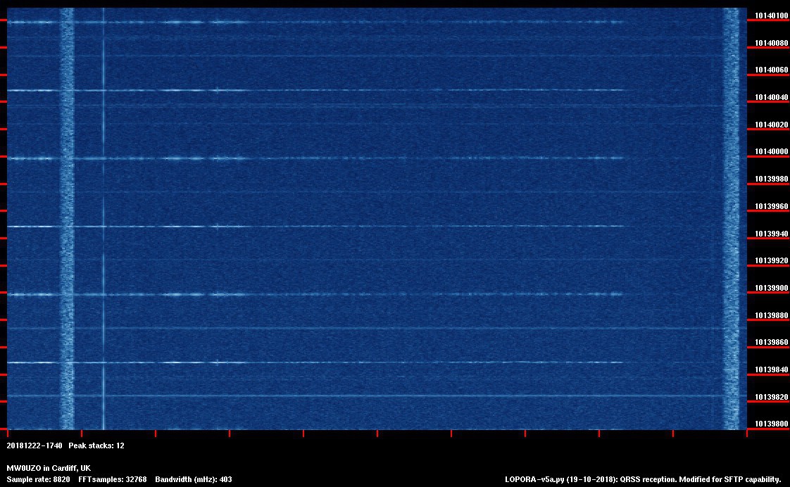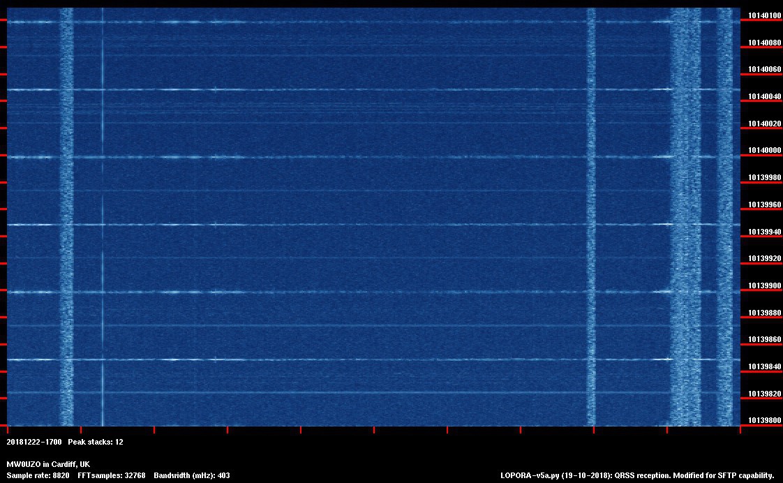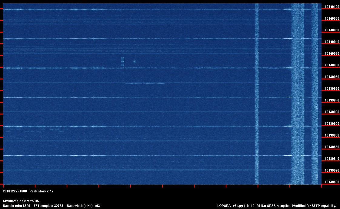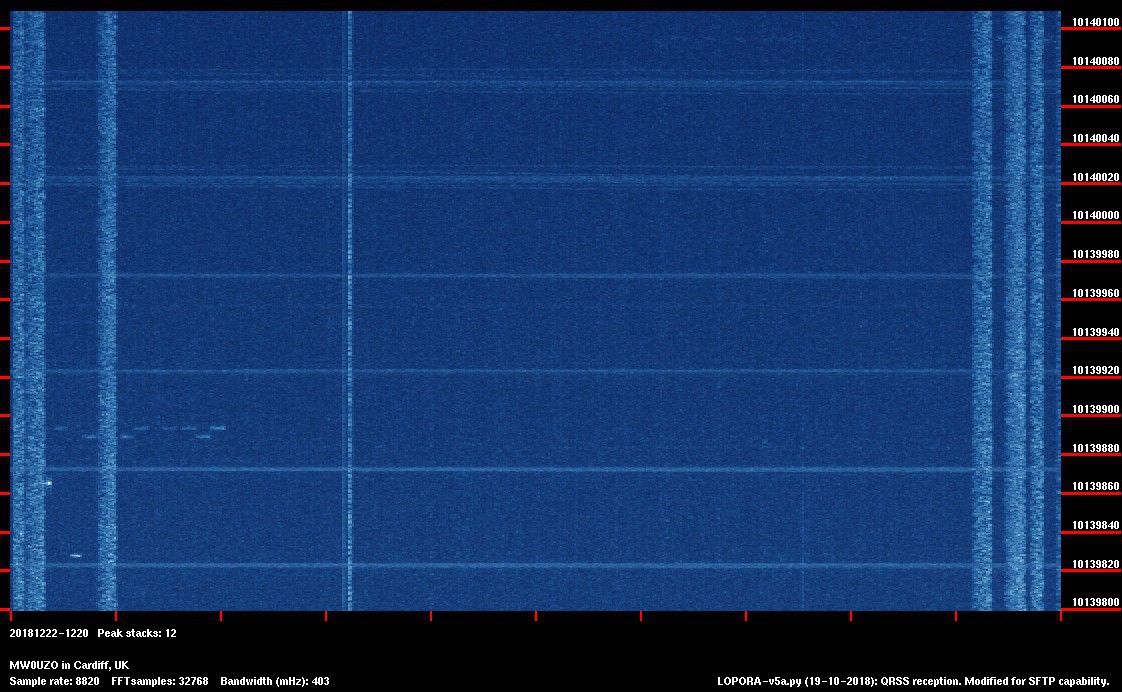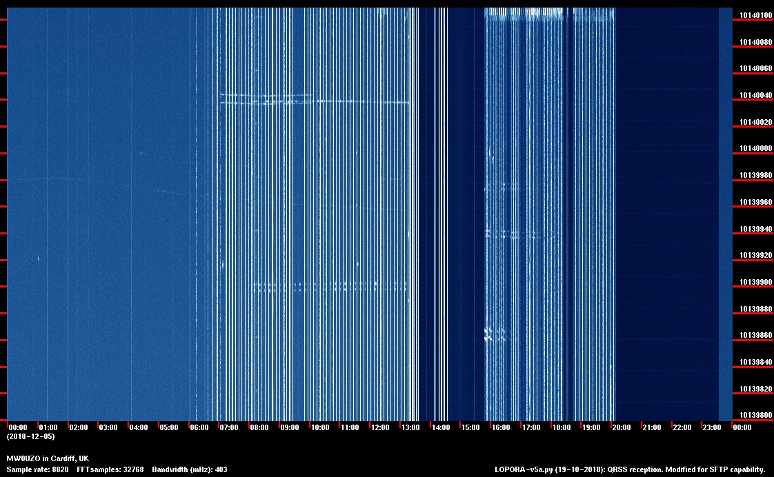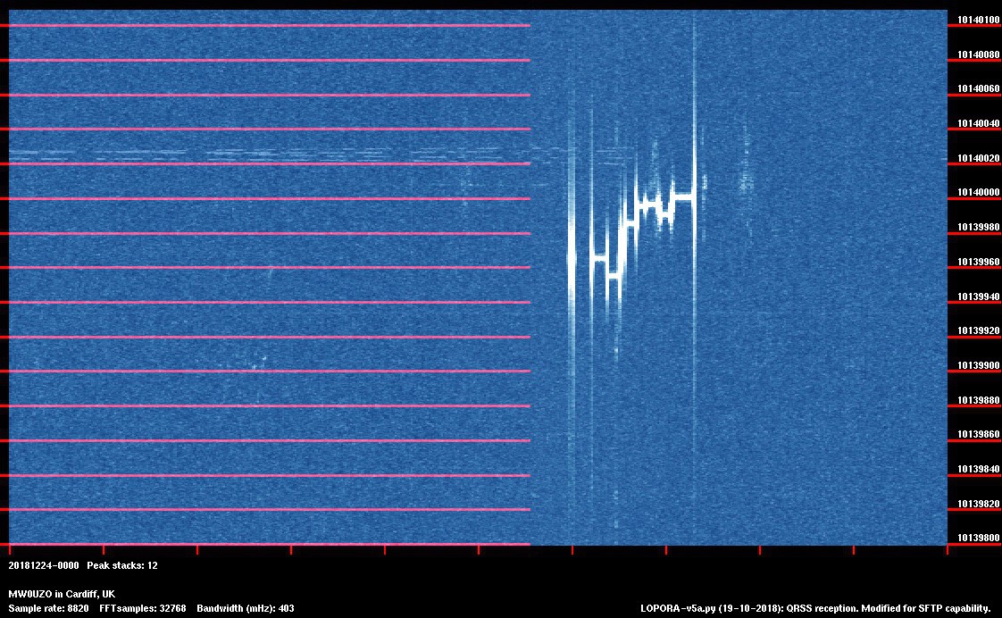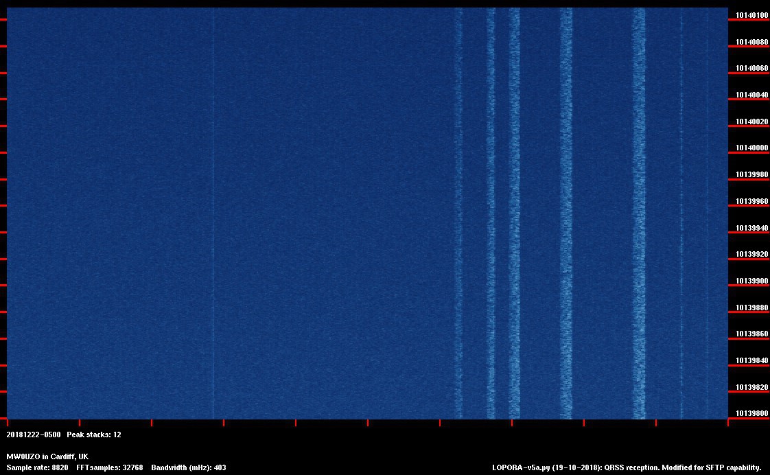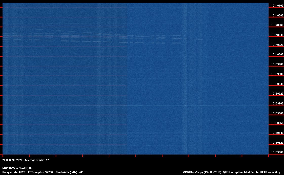 The grabber is made from a simple SDR kit, the Soft66Lite, a Behringer UCA202 USB sound card. The SDR receiver is SDR# and the FFT processing and display software is PA2OHH's excellent analysis program LOPORA. The SDR radio has a crystal frequency of 20.250Mhz with a piece of copper soldered to it, inside a homebrew crystal oven.