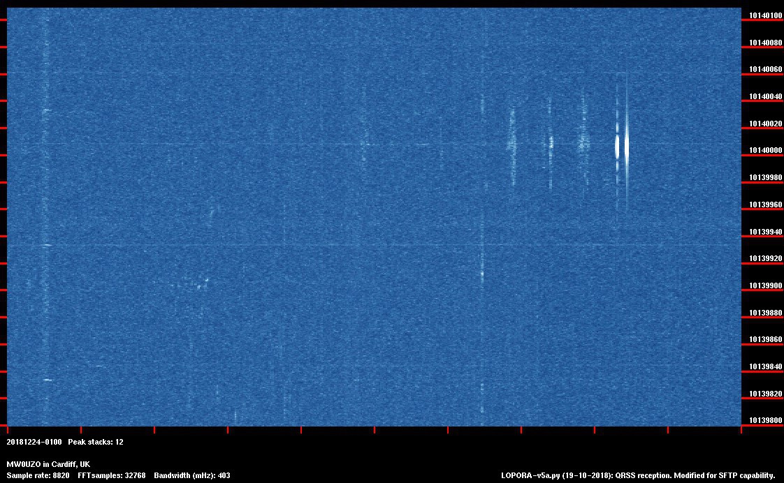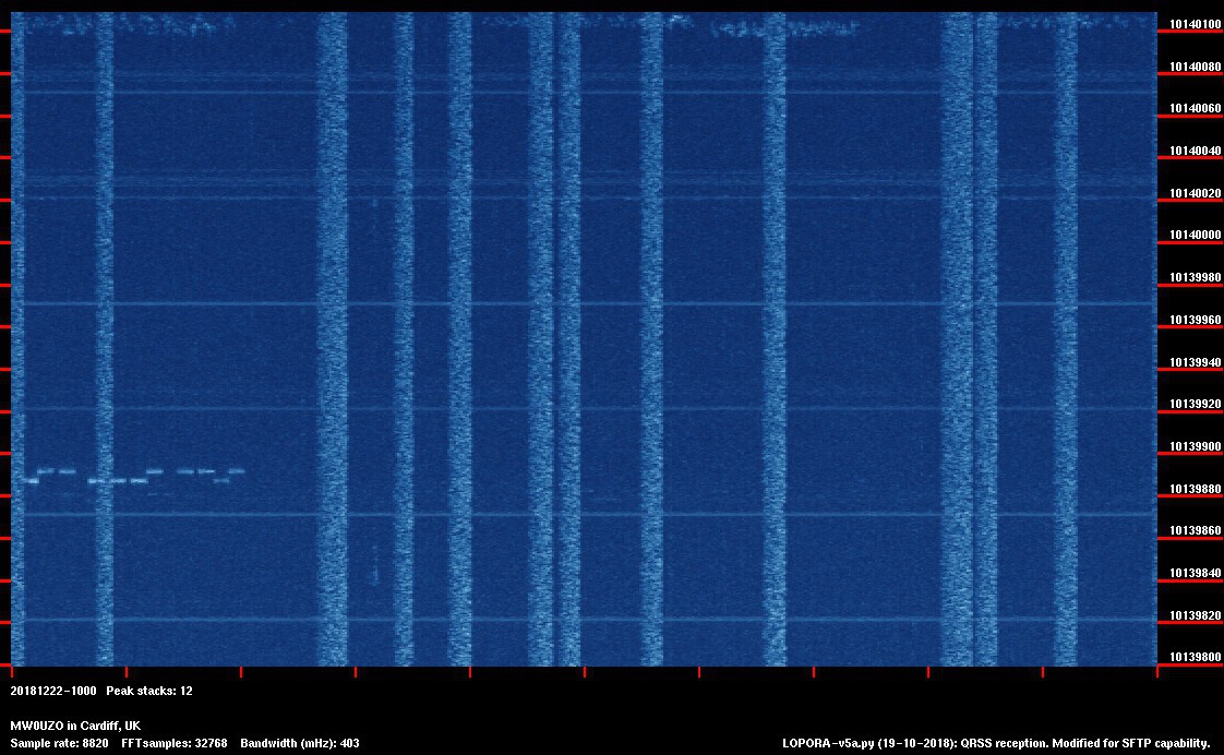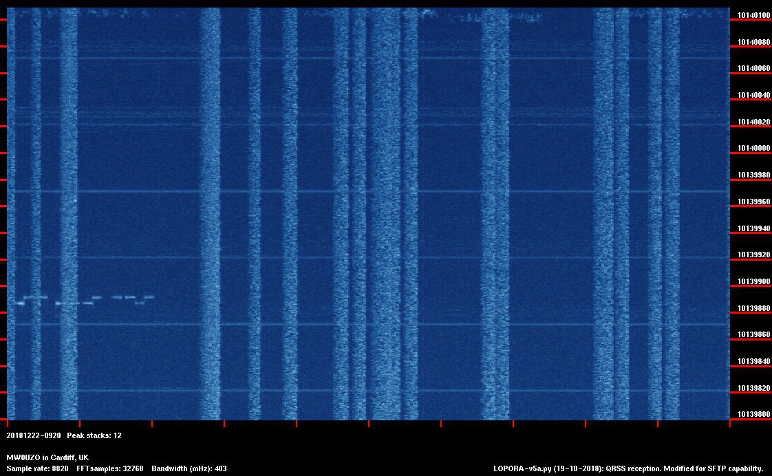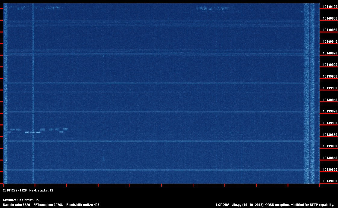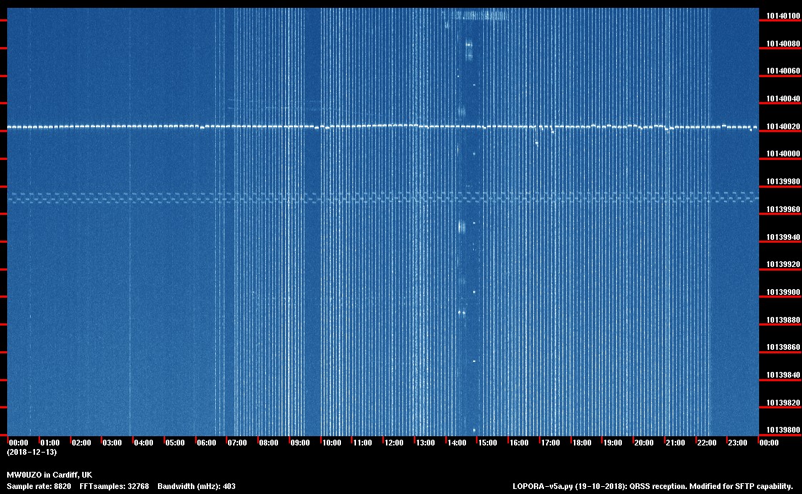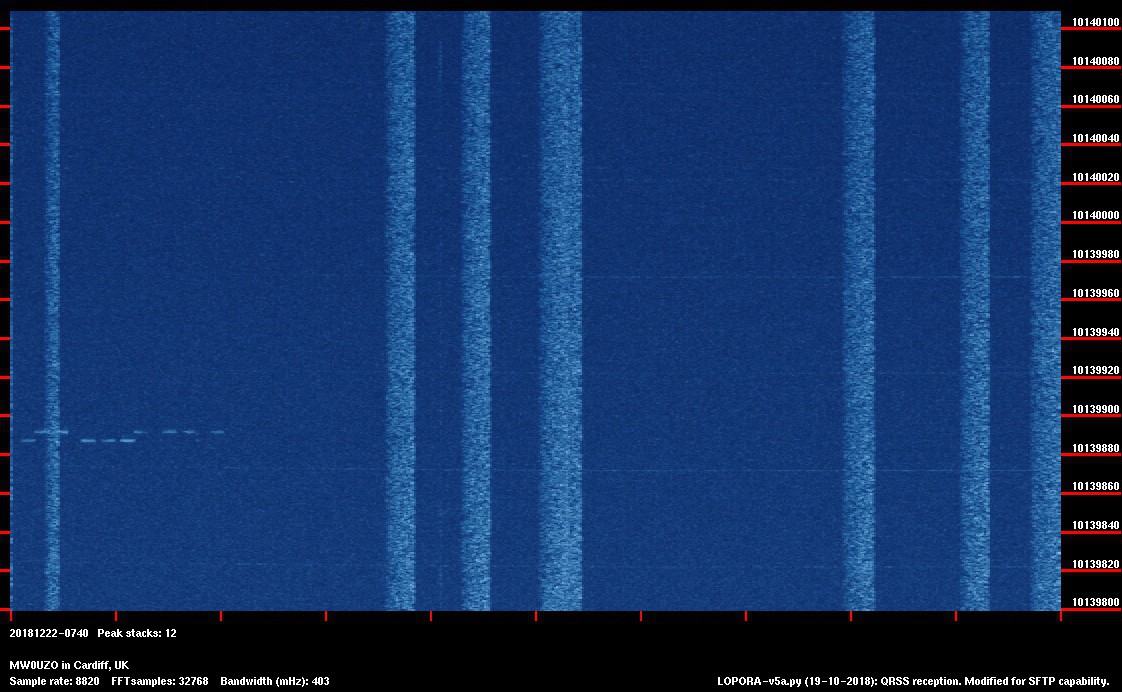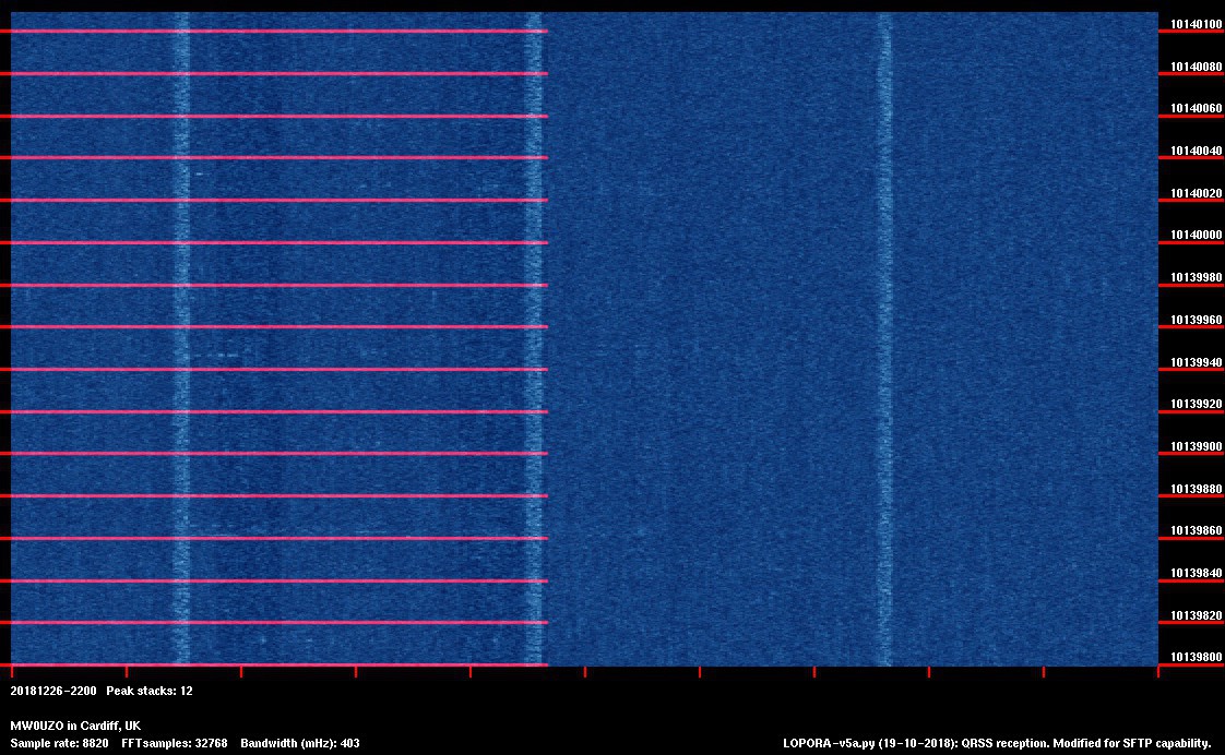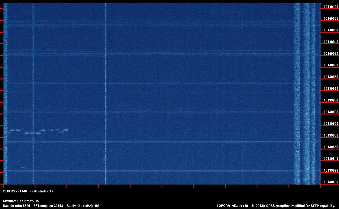 The grabber is made from a simple SDR kit, the Soft66Lite, a Behringer UCA202 USB sound card. The SDR receiver is SDR# and the FFT processing and display software is PA2OHH's excellent analysis program LOPORA. The SDR radio has a crystal frequency of 20.250Mhz with a piece of copper soldered to it, inside a homebrew crystal oven.