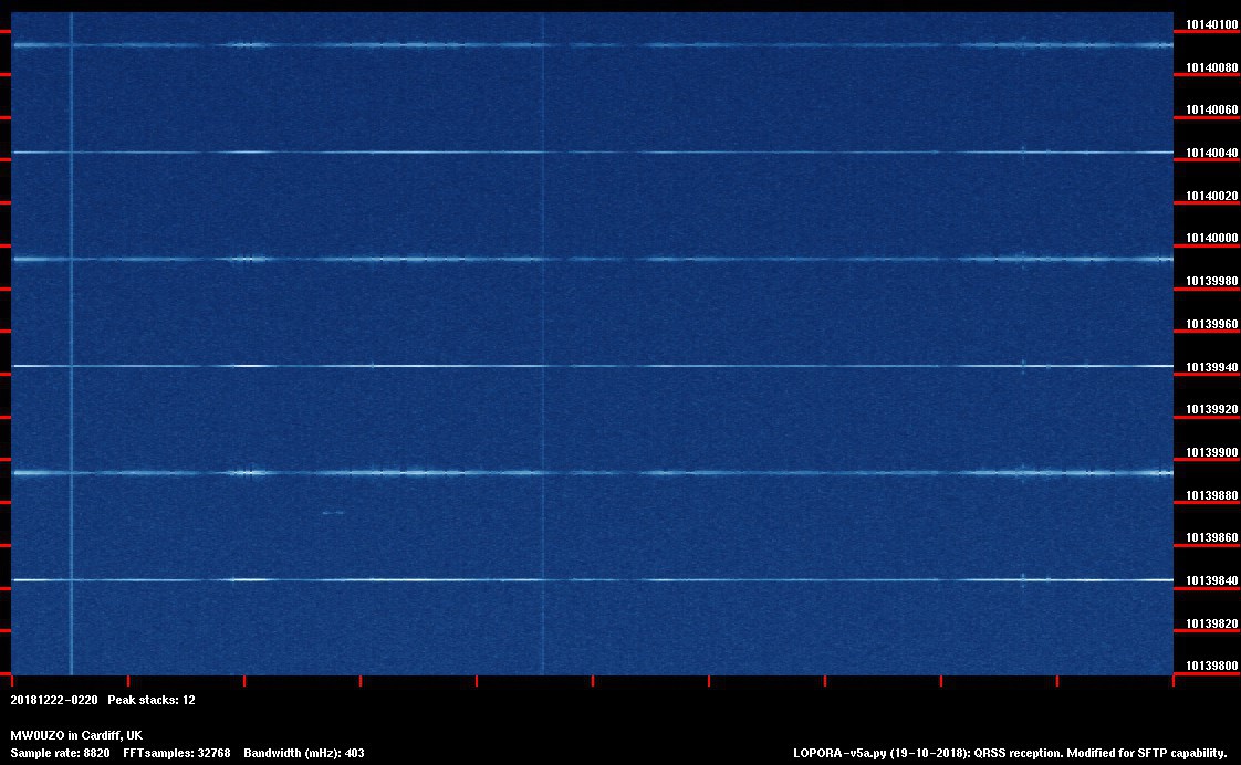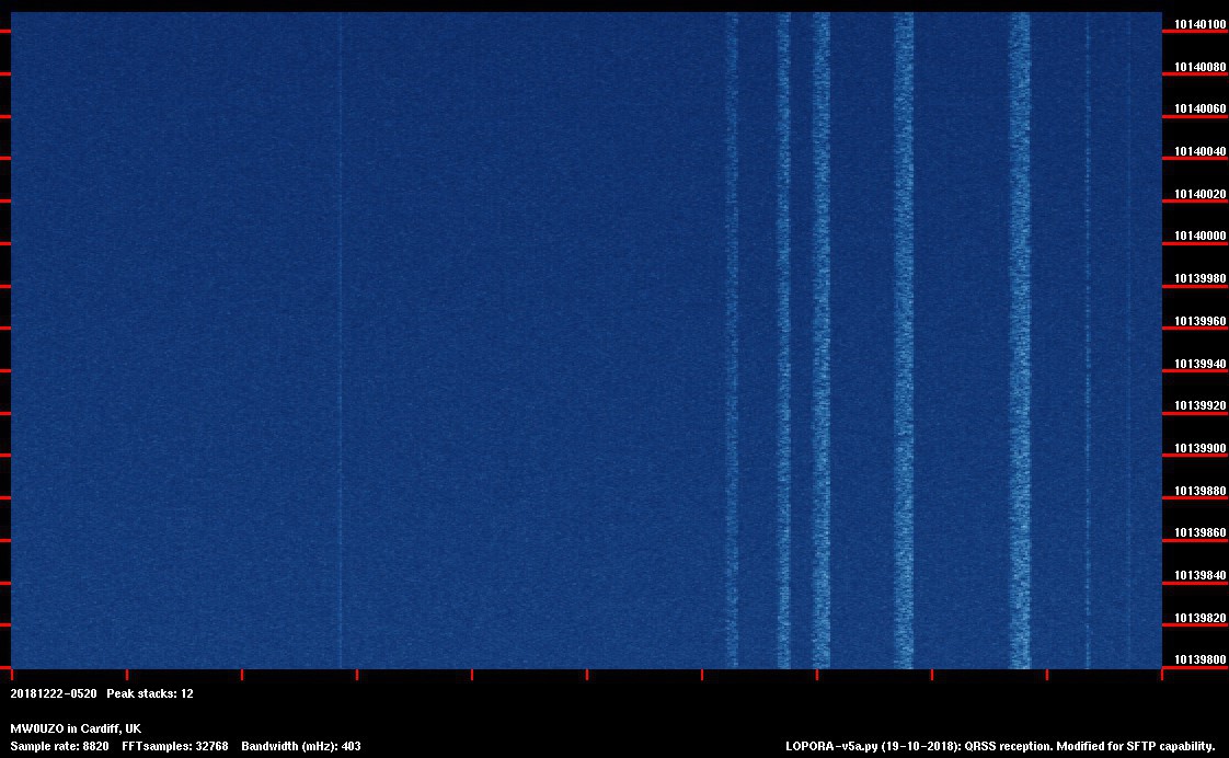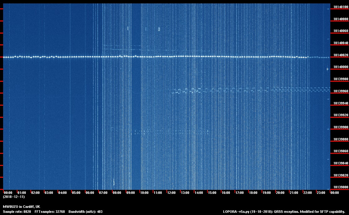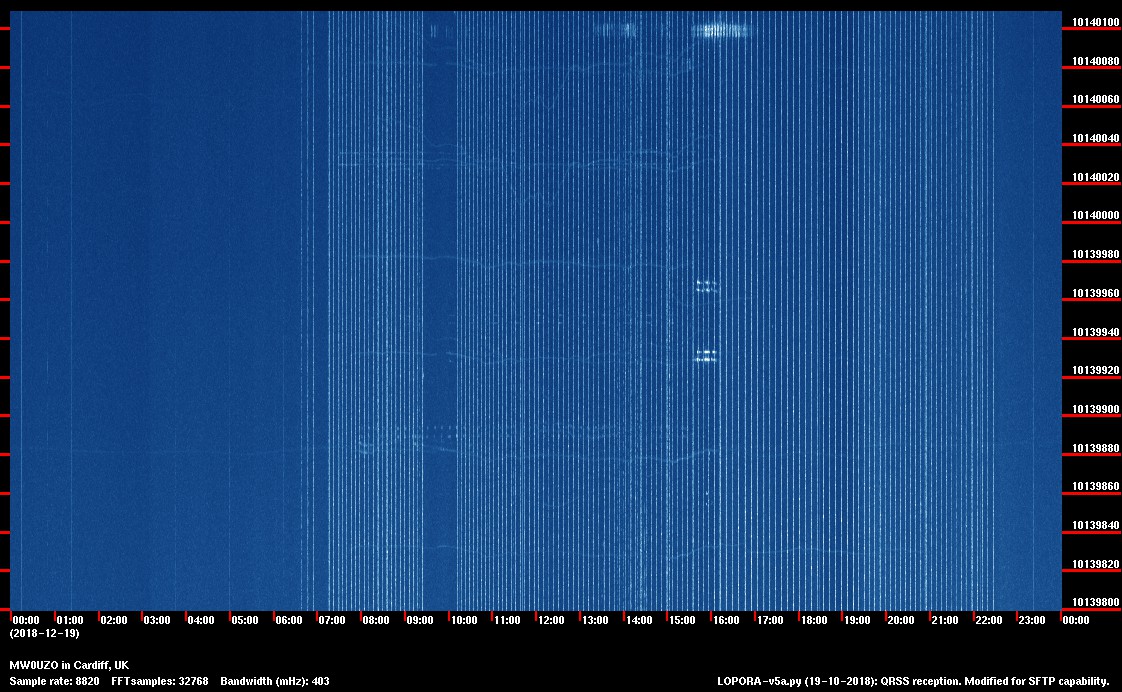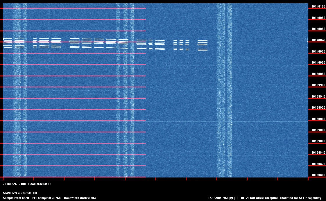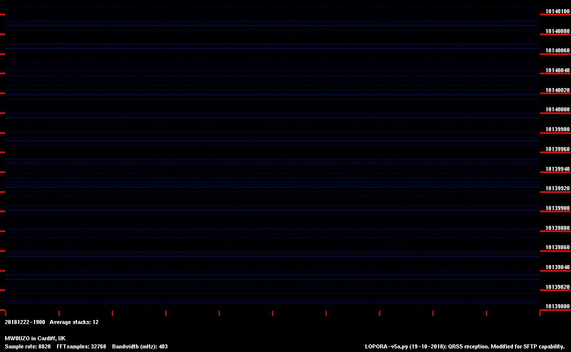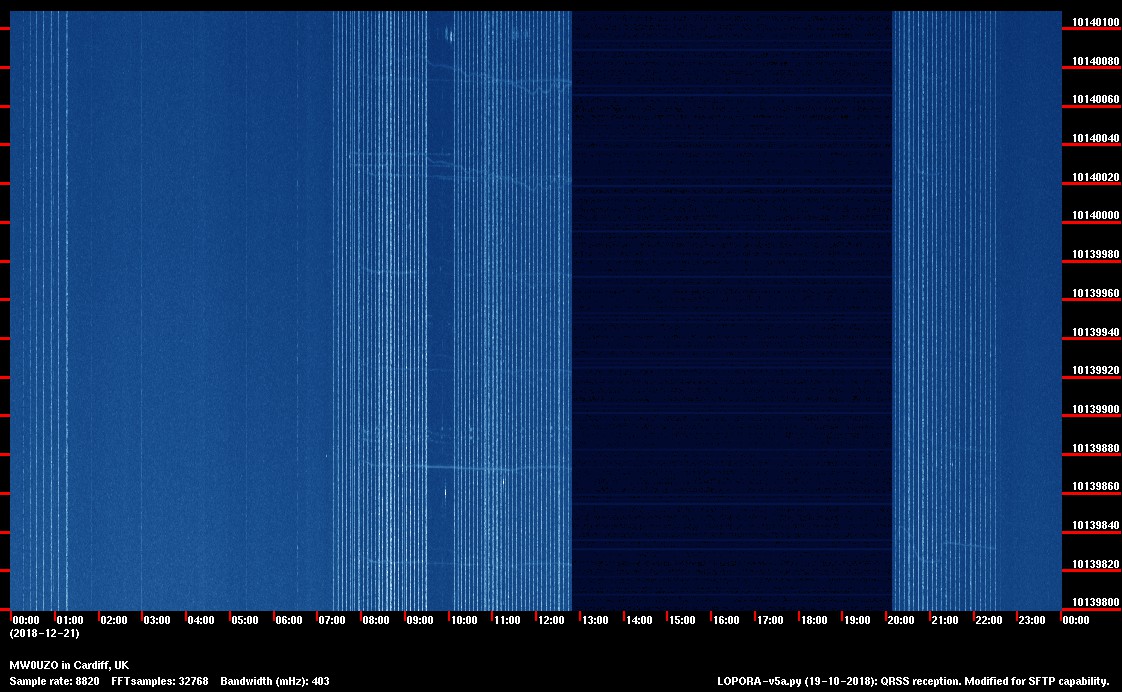 The grabber is made from a simple SDR kit, the Soft66Lite, a Behringer UCA202 USB sound card. The SDR receiver is SDR# and the FFT processing and display software is PA2OHH's excellent analysis program LOPORA. The SDR radio has a crystal frequency of 20.250Mhz with a piece of copper soldered to it, inside a homebrew crystal oven.