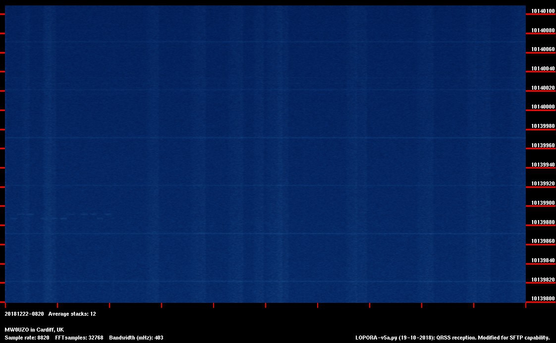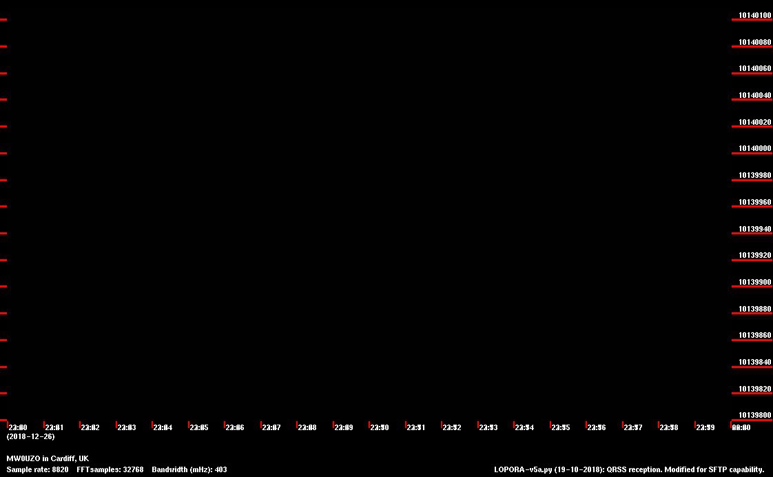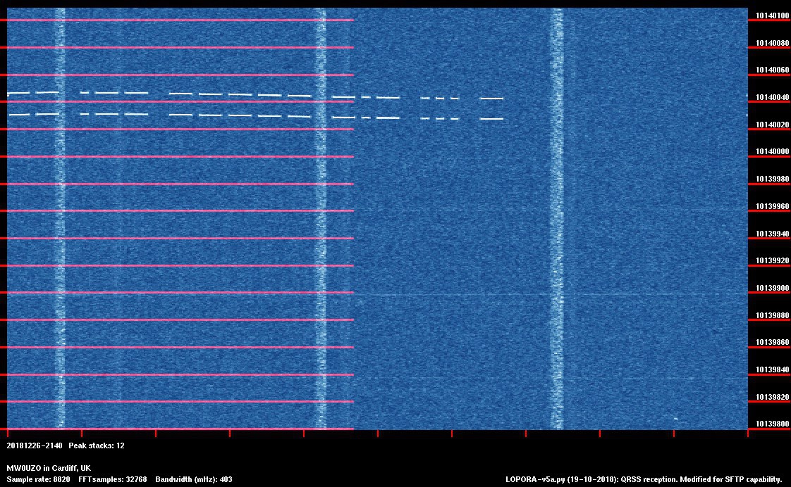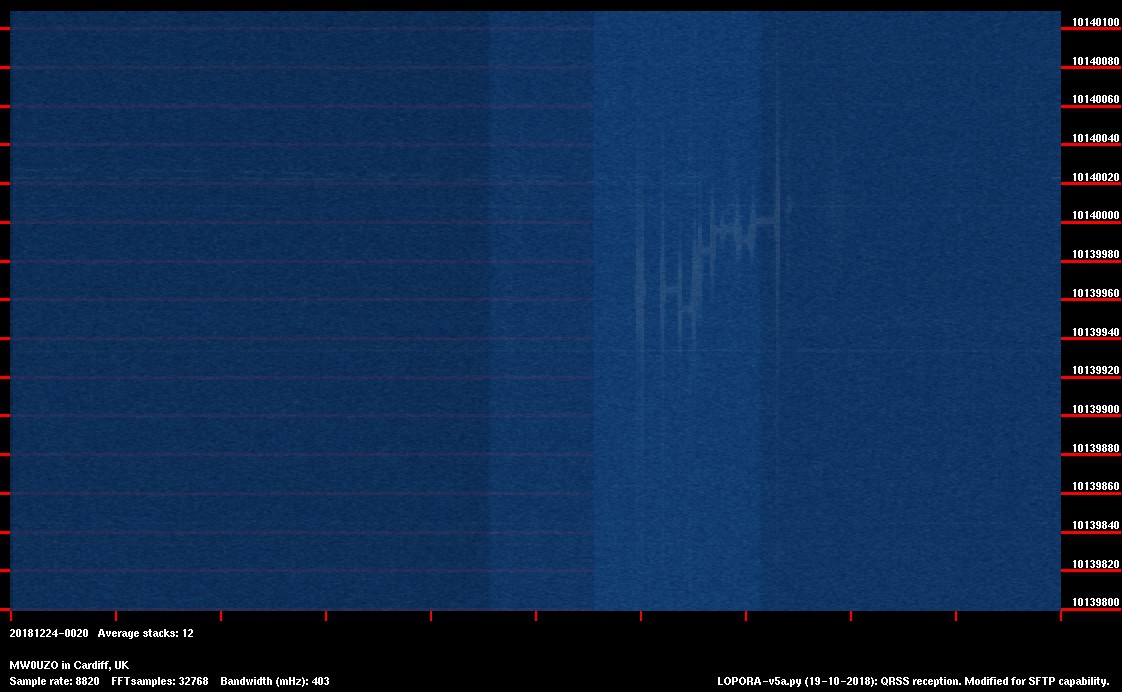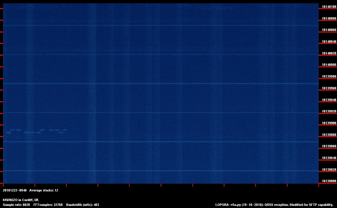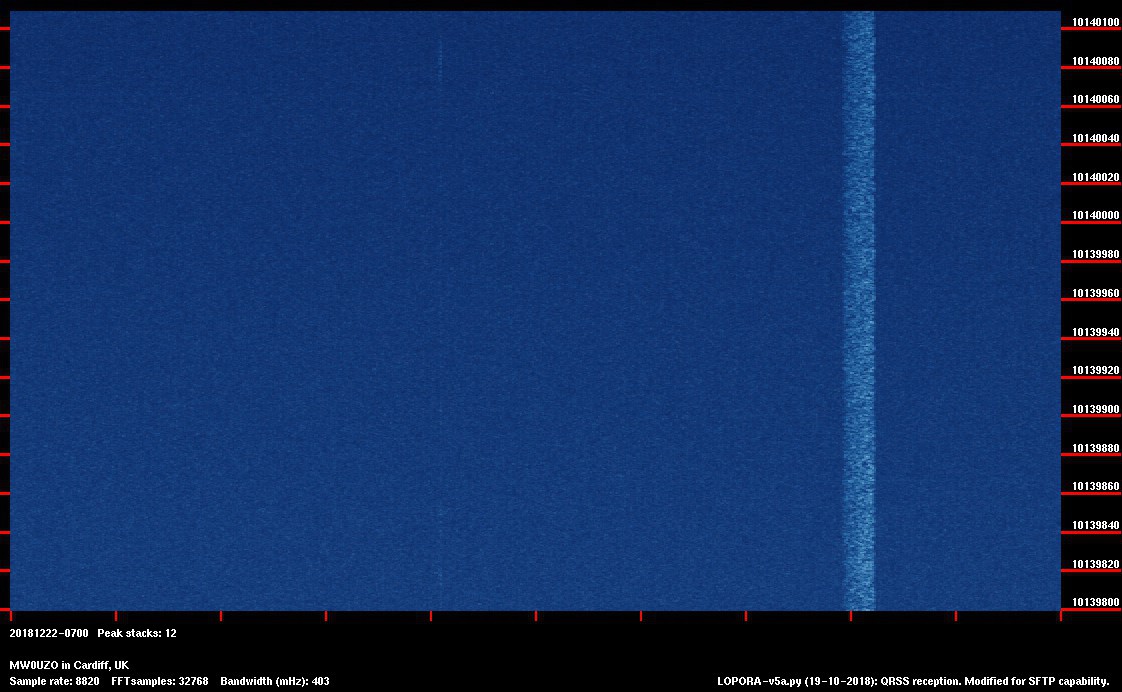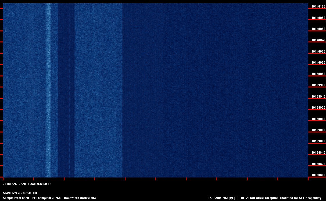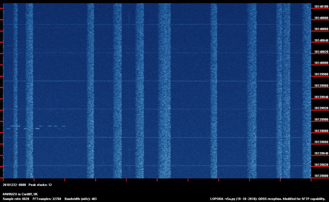 The grabber is made from a simple SDR kit, the Soft66Lite, a Behringer UCA202 USB sound card. The SDR receiver is SDR# and the FFT processing and display software is PA2OHH's excellent analysis program LOPORA. The SDR radio has a crystal frequency of 20.250Mhz with a piece of copper soldered to it, inside a homebrew crystal oven.
