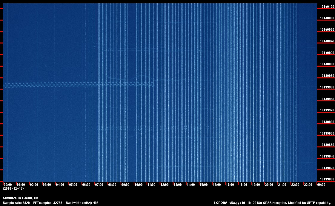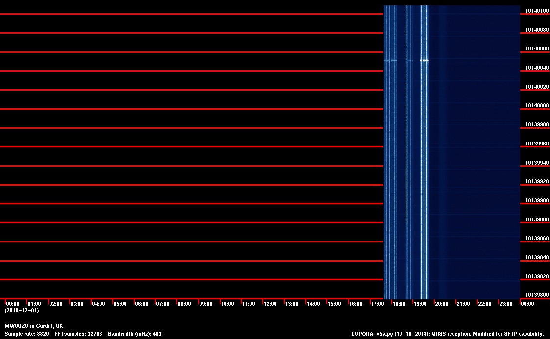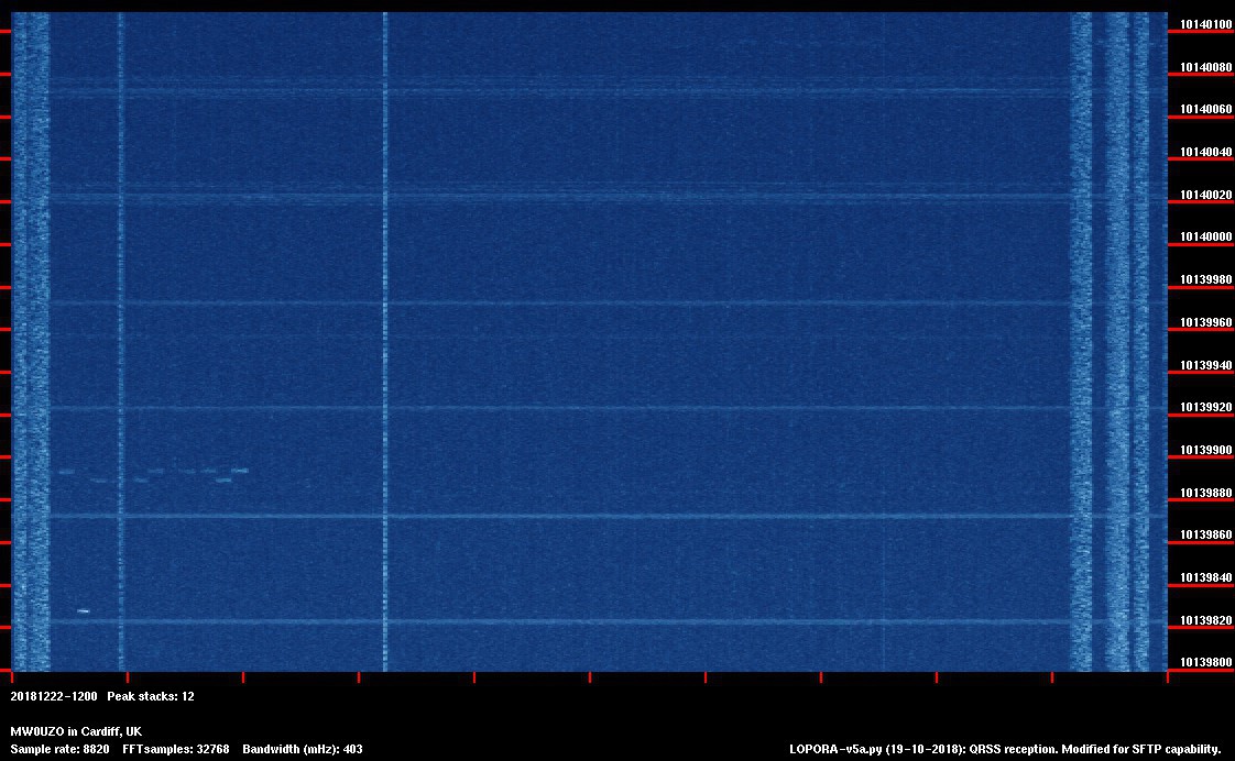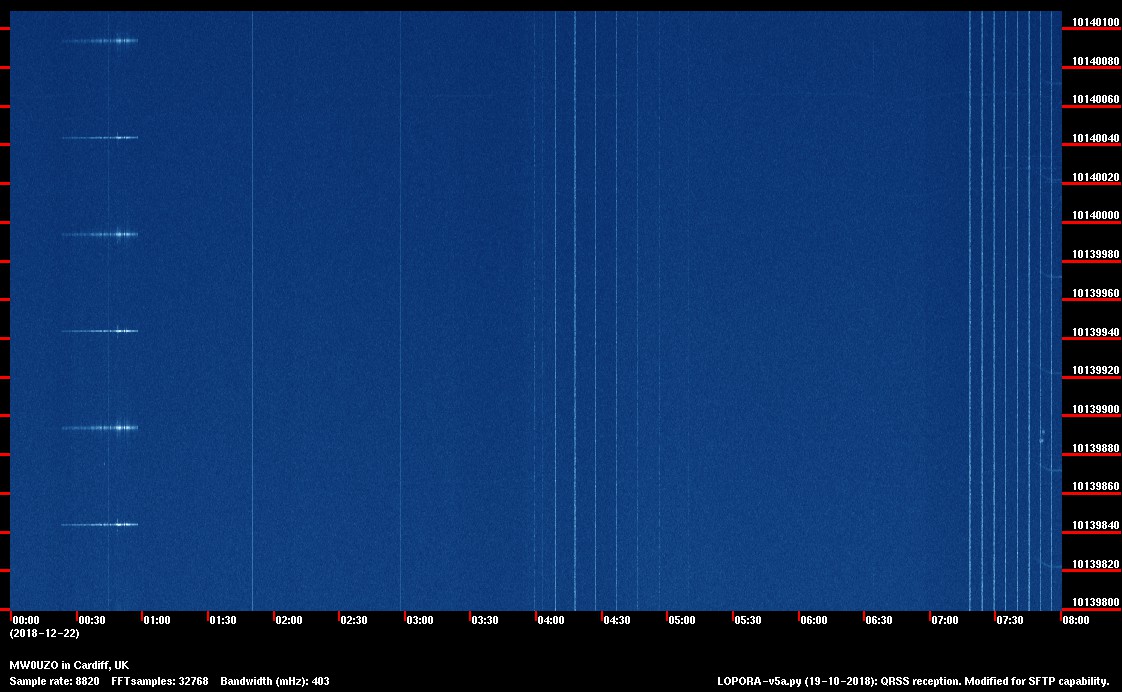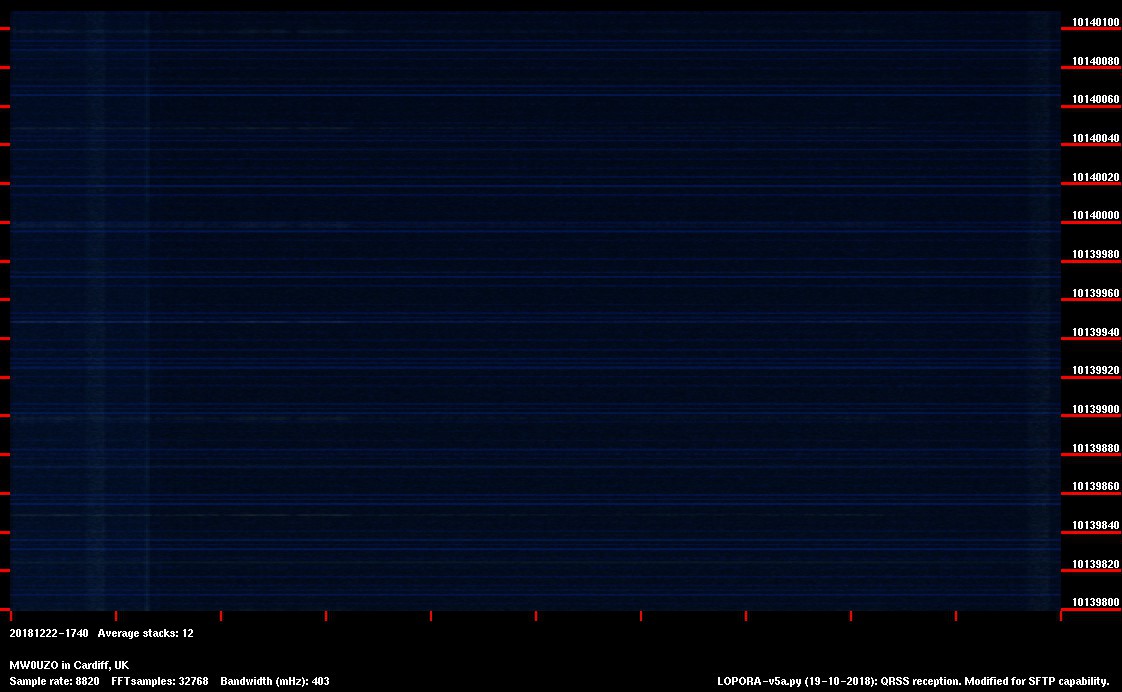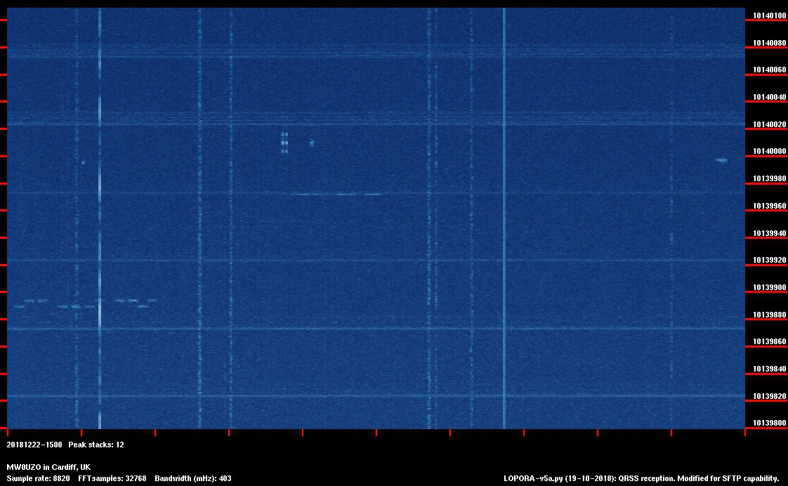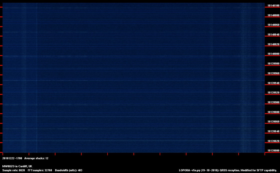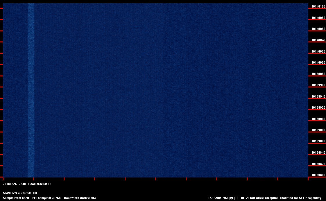 The grabber is made from a simple SDR kit, the Soft66Lite, a Behringer UCA202 USB sound card. The SDR receiver is SDR# and the FFT processing and display software is PA2OHH's excellent analysis program LOPORA. The SDR radio has a crystal frequency of 20.250Mhz with a piece of copper soldered to it, inside a homebrew crystal oven.