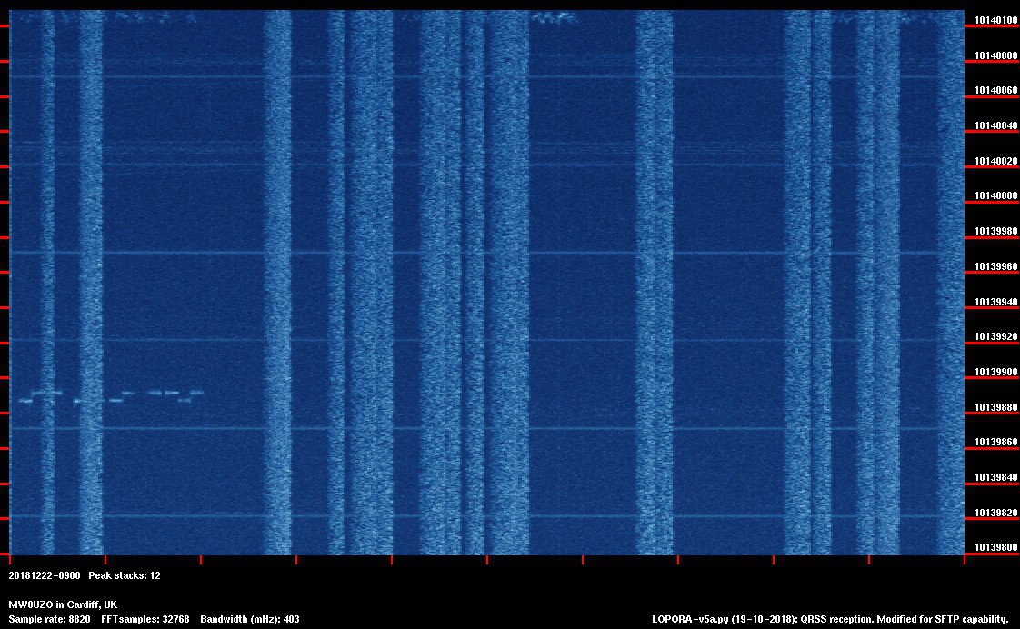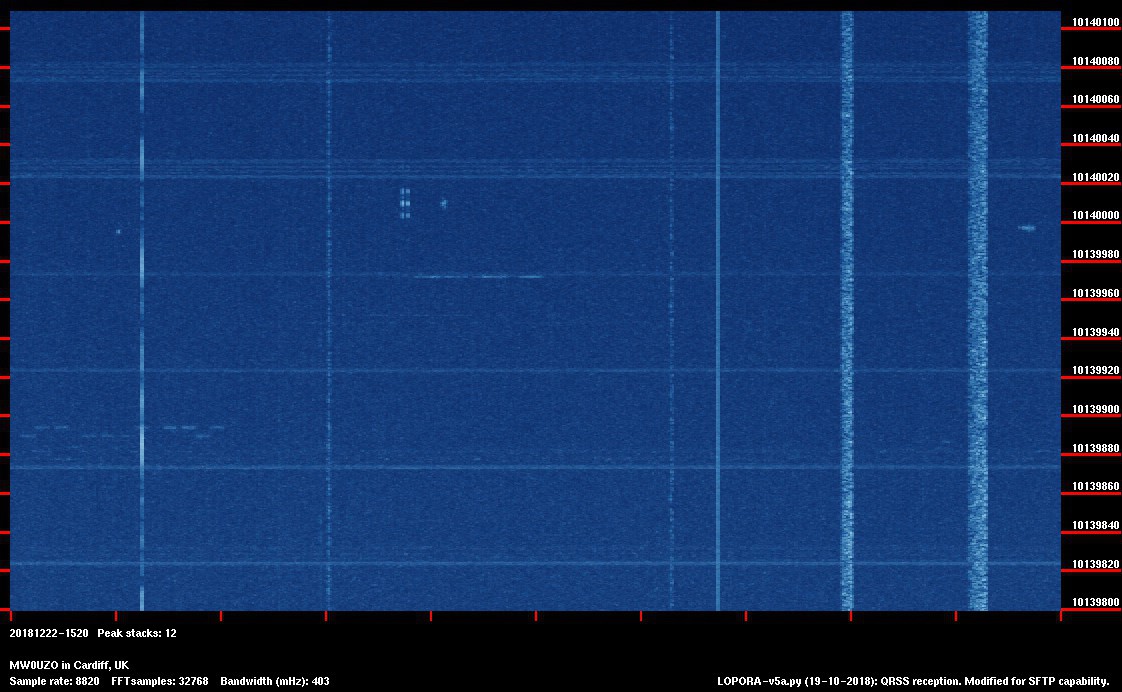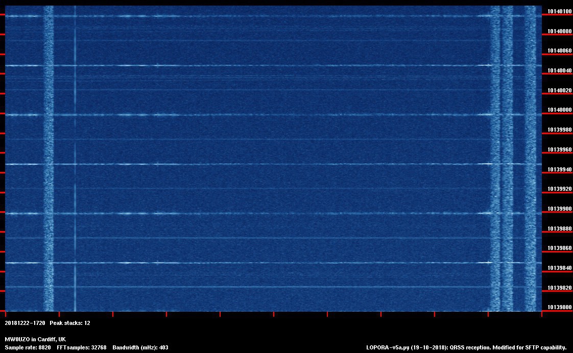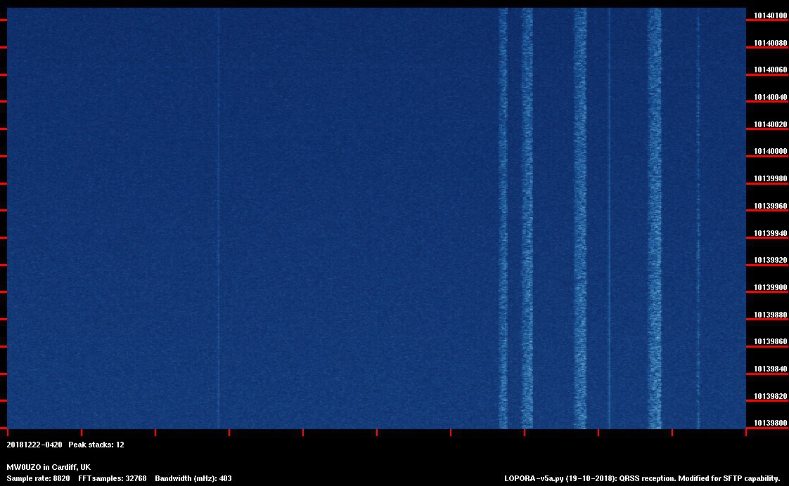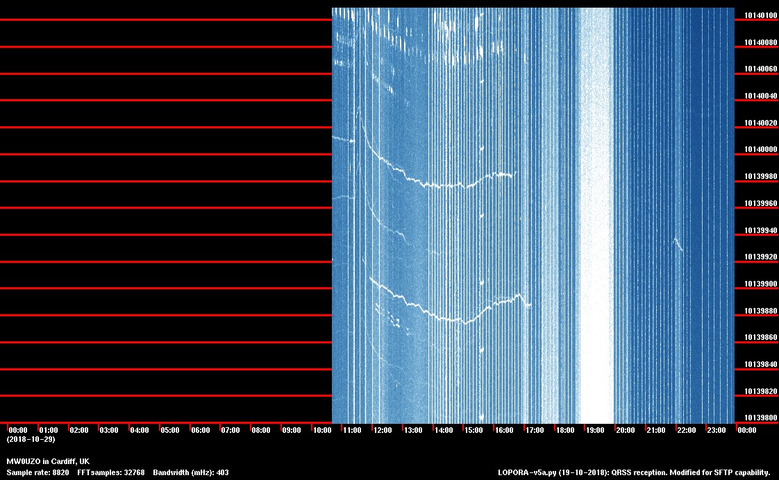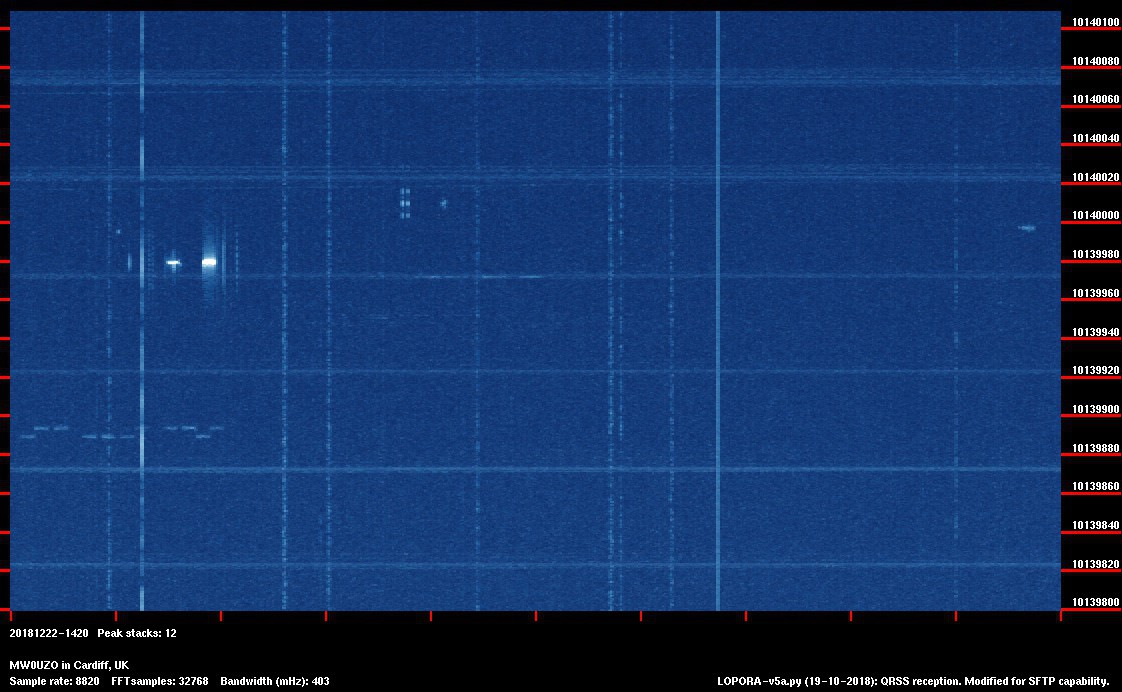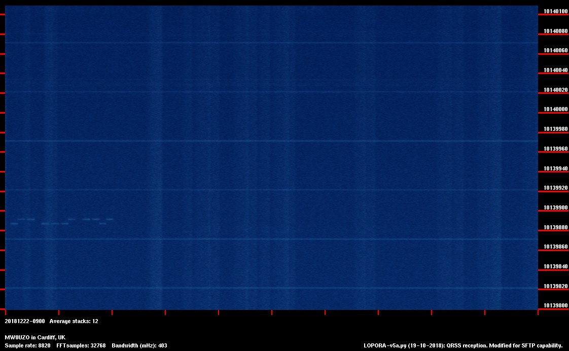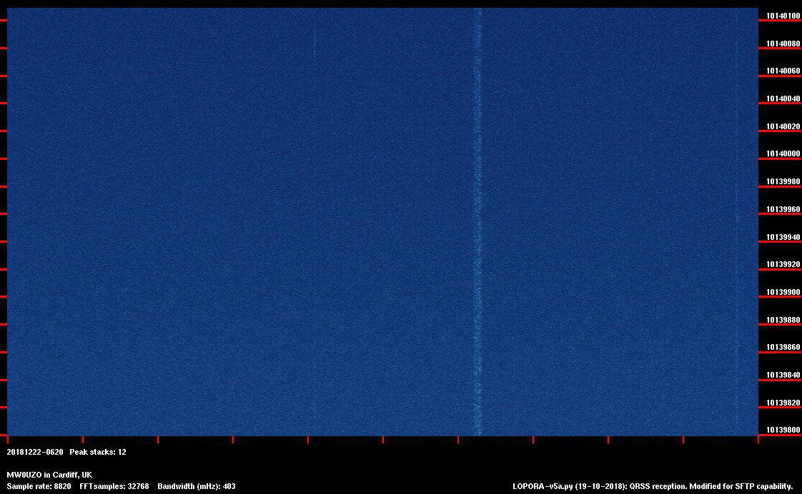 The grabber is made from a simple SDR kit, the Soft66Lite, a Behringer UCA202 USB sound card. The SDR receiver is SDR# and the FFT processing and display software is PA2OHH's excellent analysis program LOPORA. The SDR radio has a crystal frequency of 20.250Mhz with a piece of copper soldered to it, inside a homebrew crystal oven.