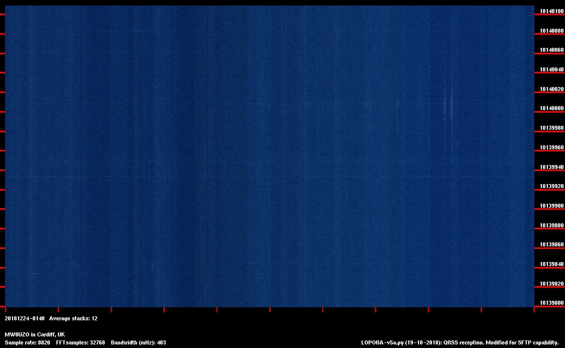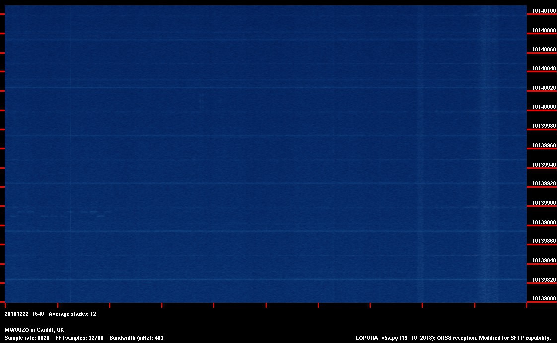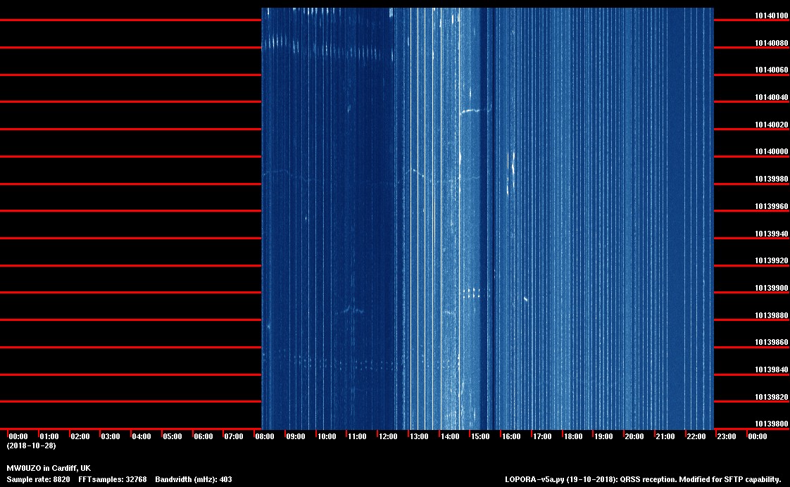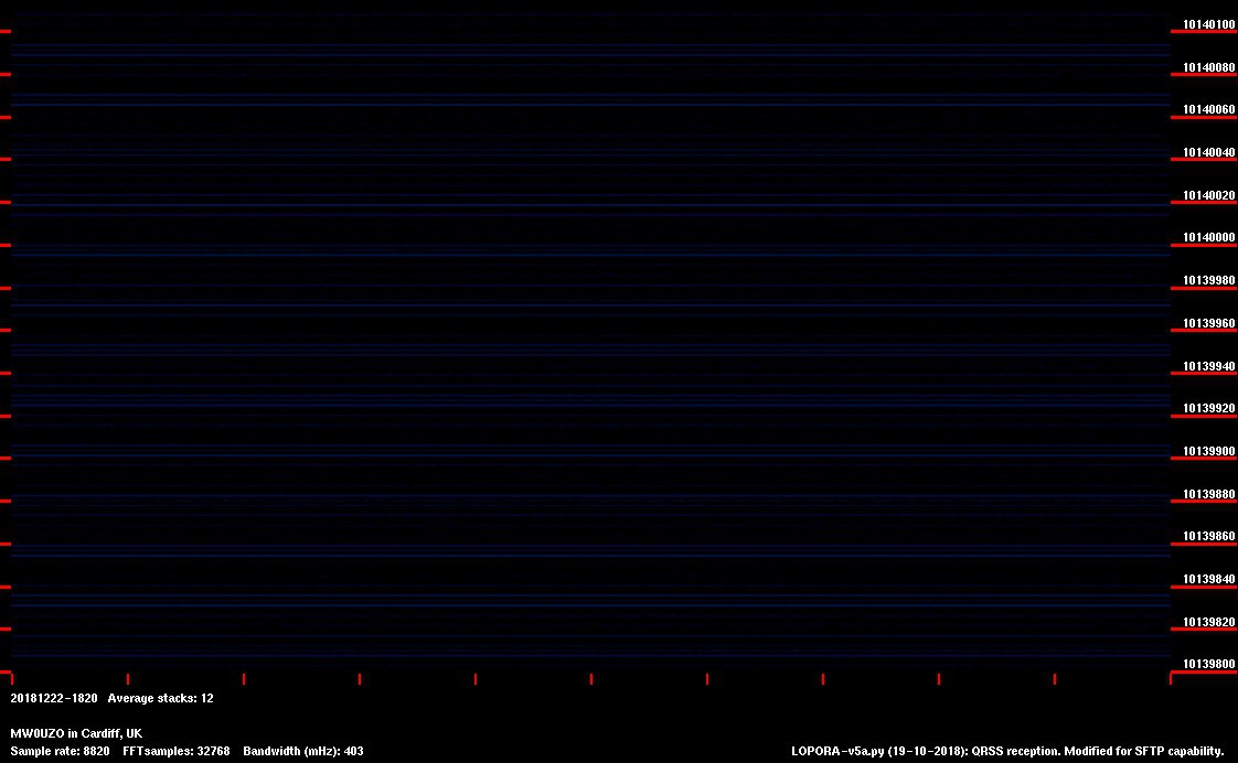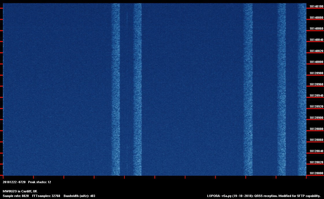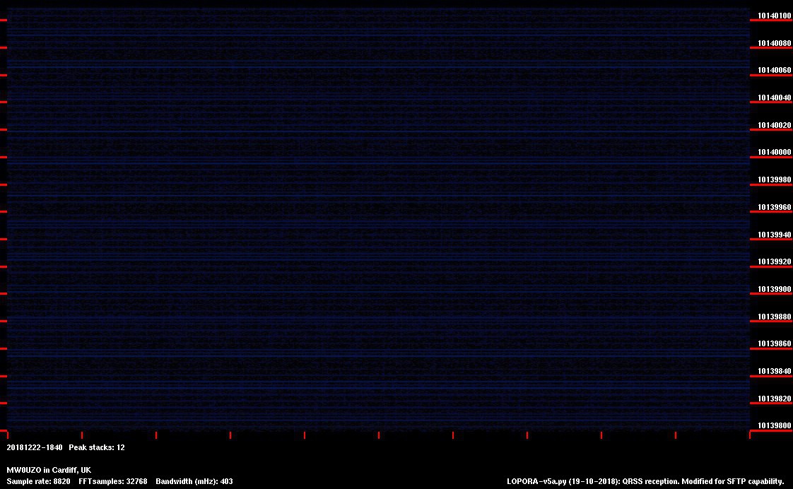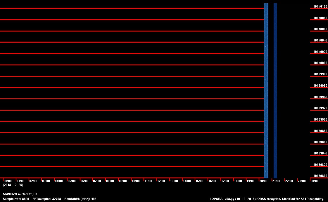 The grabber is made from a simple SDR kit, the Soft66Lite, a Behringer UCA202 USB sound card. The SDR receiver is SDR# and the FFT processing and display software is PA2OHH's excellent analysis program LOPORA. The SDR radio has a crystal frequency of 20.250Mhz with a piece of copper soldered to it, inside a homebrew crystal oven.