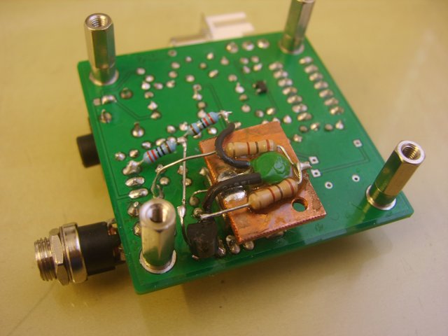 The crystal oven was attached to the underside of the PCB. The crystal was folded over, grounded at one end, then a piece of copper was soldered on top. A 50R thermistor and two 100R resistors were glued to the copper. The control circuit is very simple, the 50R thermistor, 220 ohm and 47 ohm resistors form a potential divider across the 5V supply. The 47 ohm resistor raises the voltage across the thermistor so the transistor switches off at a hotter temperature. This turns on and off the 2SC1815 transistor which controls the 12V supply to the heater resistors. With a 100R thermistor and a single heater resistor, the component count could be reduced to four. A small plastic case made from scraps was glued together and placed over the circuit.