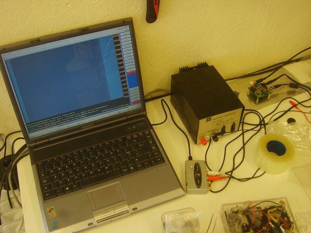 The following two photos show the SDR receiver connected up on the workbench and the development setup.