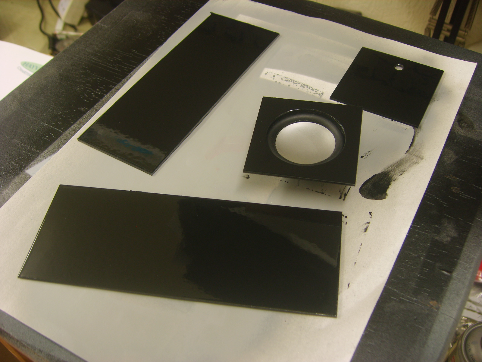 The bottom half with the speaker fitted. I tried covering the top and sides to see where the cabinet was resonant, it seemed up at 400Hz or something like that, making the audio sound a bit like someone talking into a bin. That was no good, so a port would be necessary to move the resonant point down a lot. A sawed off 25ml syringe seemed the perfect size and length.