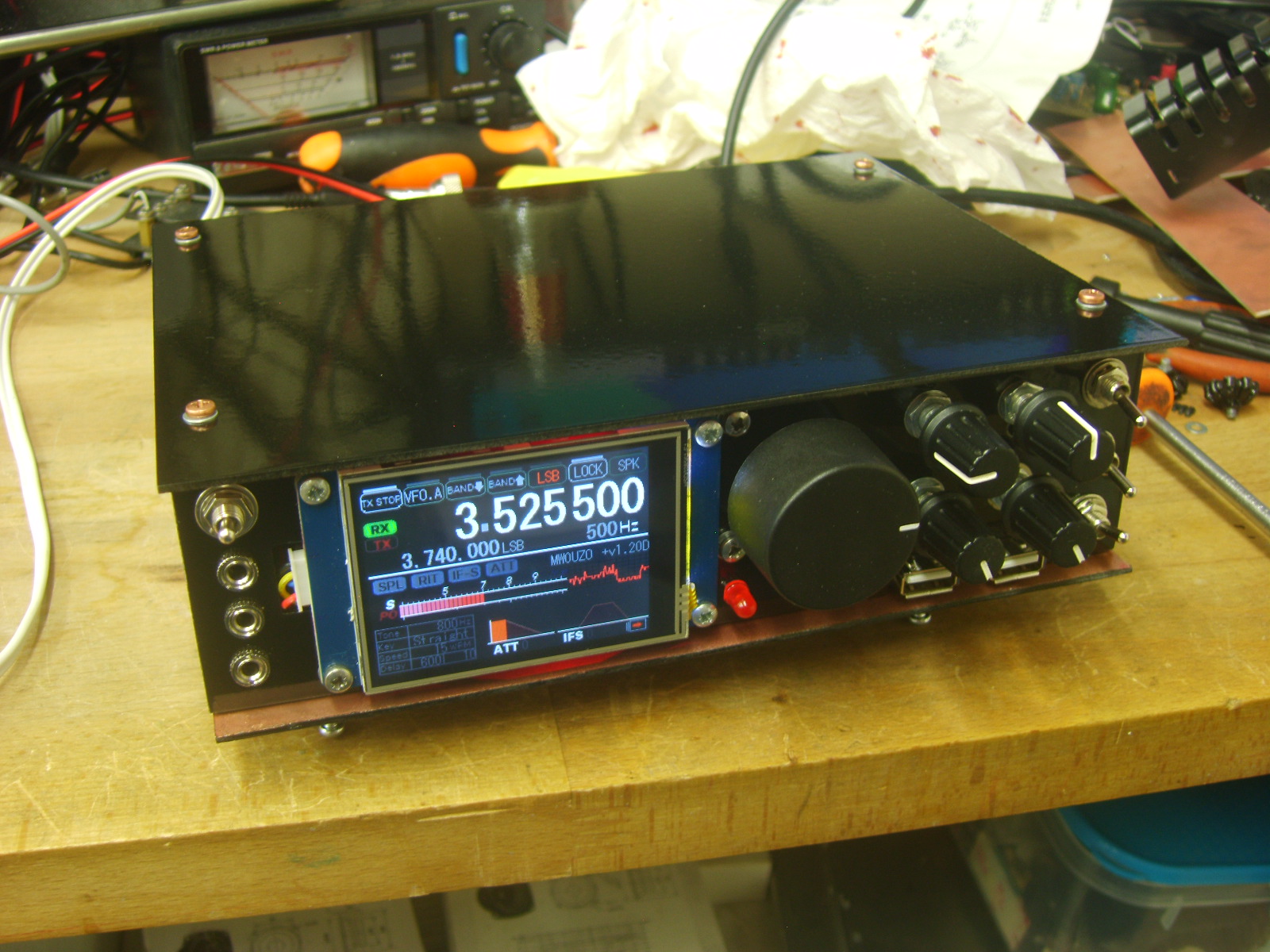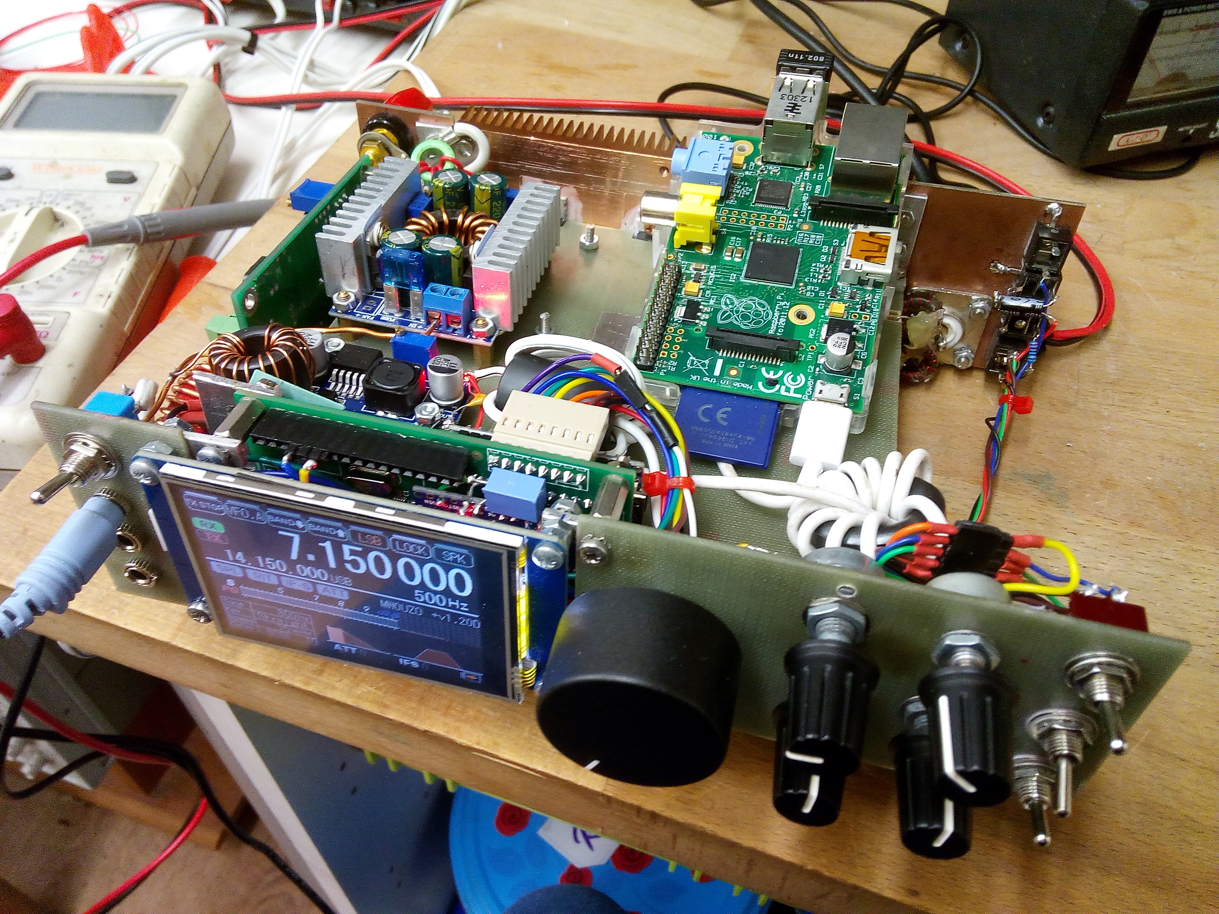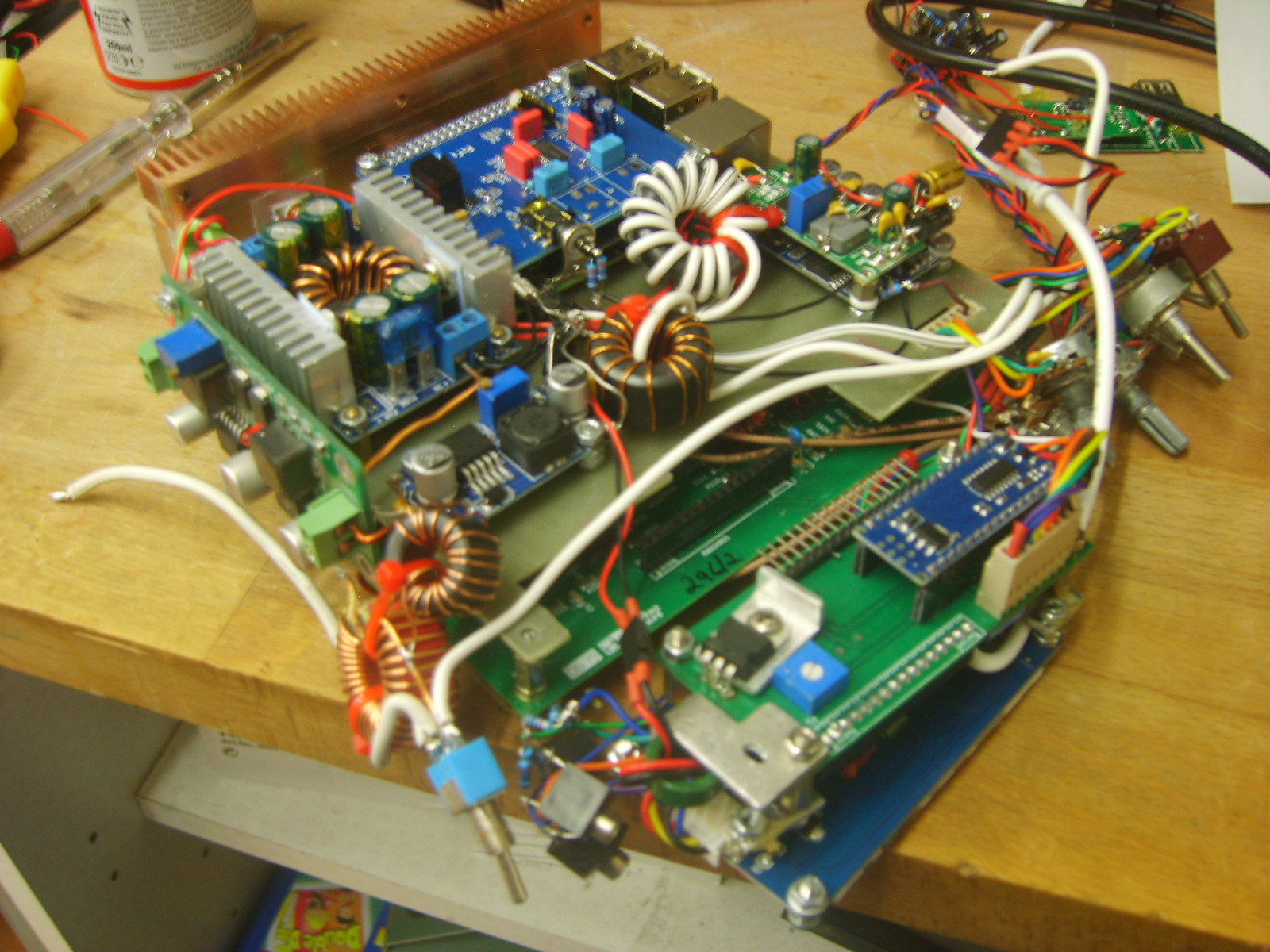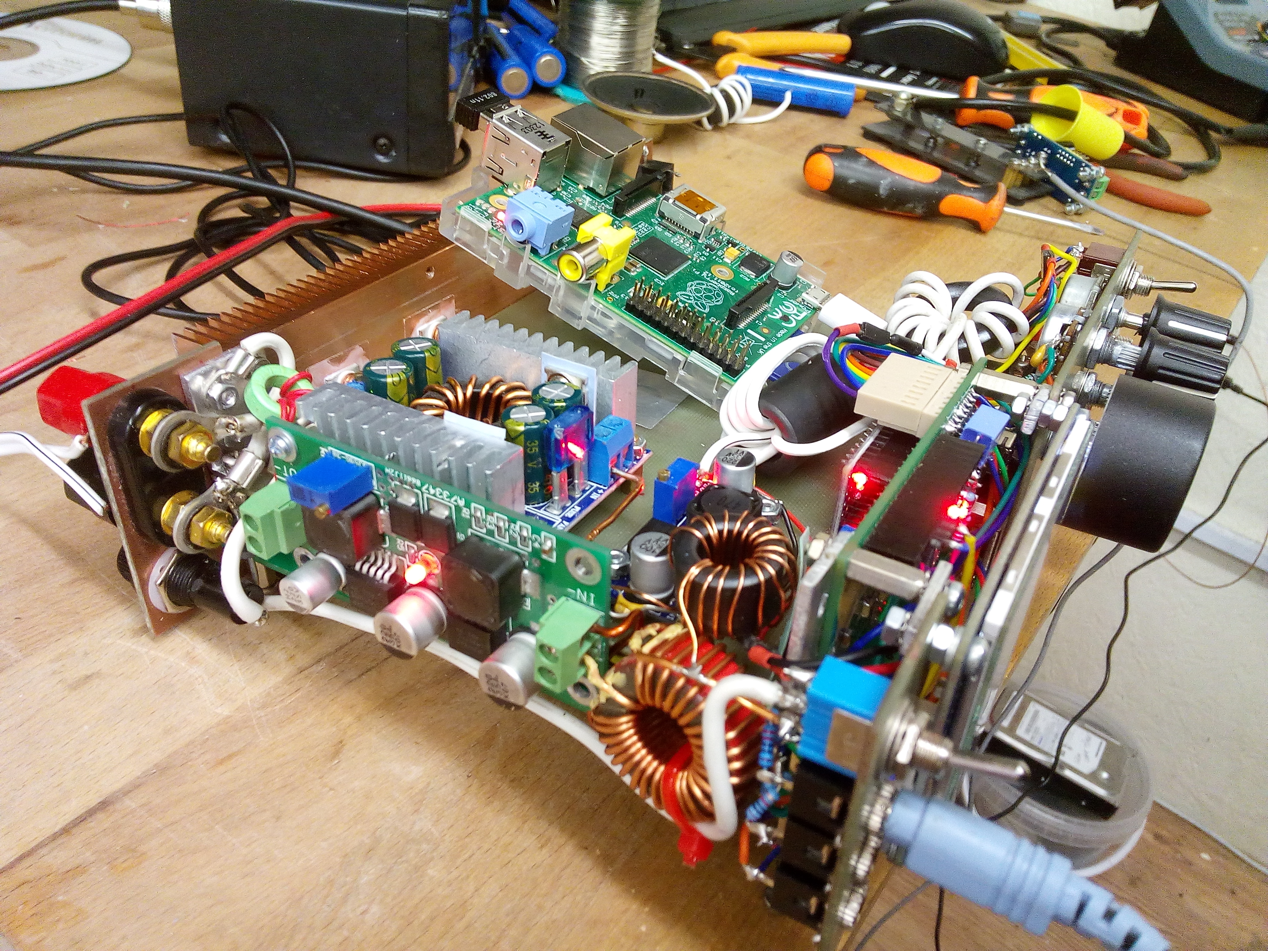 The small one at the front is a 5V types for the display, backlighting etc. The arduinos run from a linear 5V regulated supply on the Raduino board, due to psu noise being too high for the audio processing on the signal board. These supplies are mounted on a centrepiece of copper clad board, which shields the RF receiver sections from the switching supplies and the Raspberry Pi. Initially, as expected, I experienced some interference from the switchers and computer, however I was able to reduce the interfering signals to surprisingly low levels by including large RF chokes at the power inputs of each module, preventing stray RF hash from going back into the main power supply line. Pretty much all noise has been eliminated from the supplies, but the charging module seems to operate in quite a rough mode and generates sweeping noise which I have yet to completely eliminate, despite adding inductors and caps over it to try to eliminate the problem. While I continue to work on solving the problem, I can use the switch on the front to take the battery out of charge mode, which eliminates the noise.