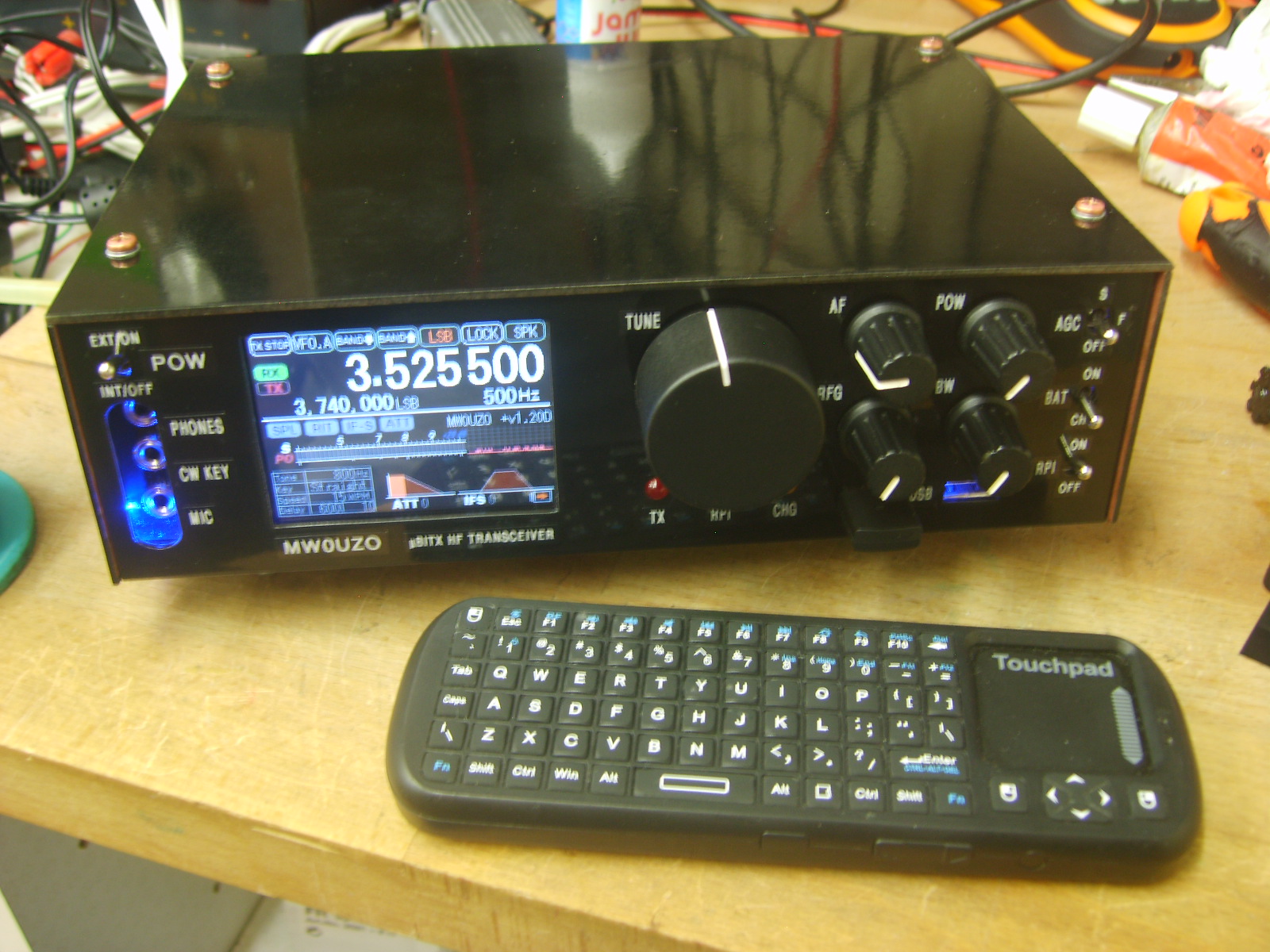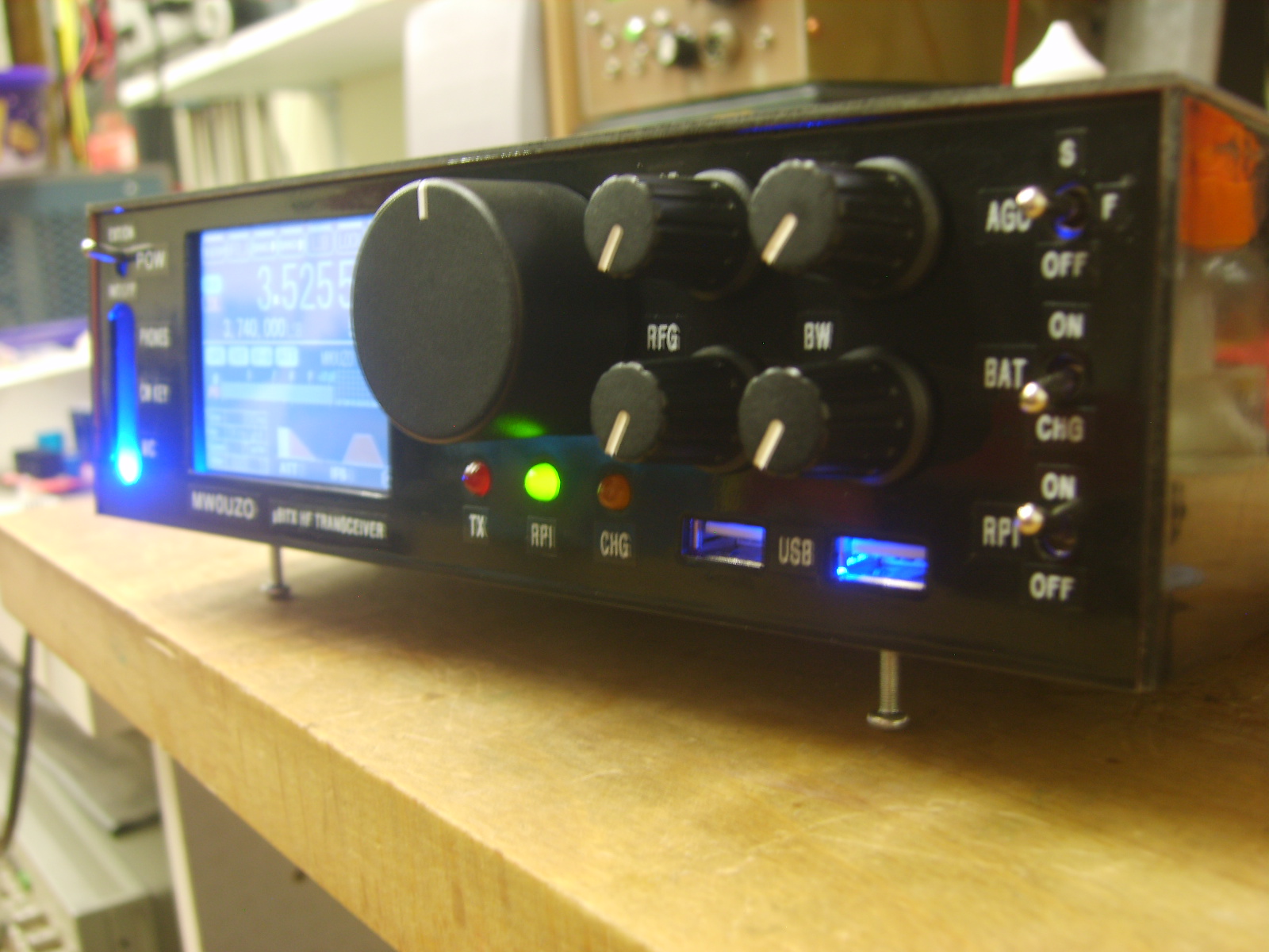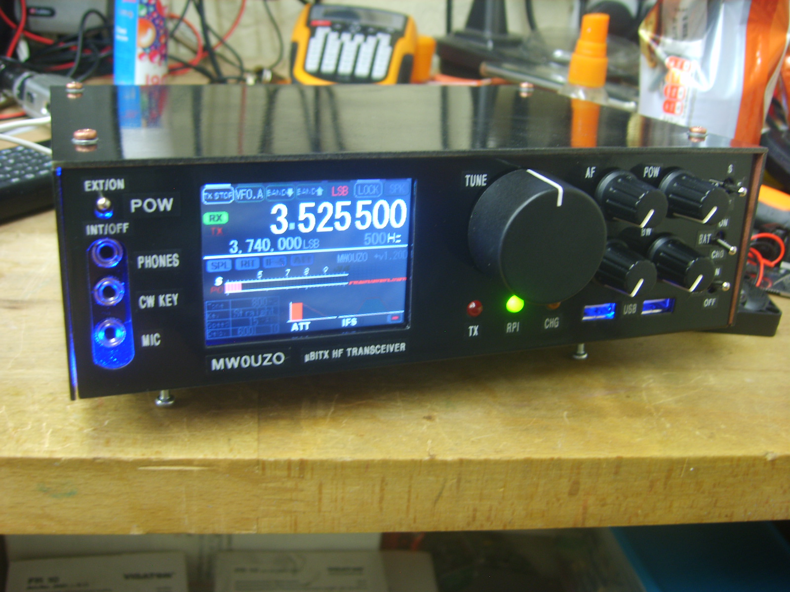 The small one at the front is a 5V types for the display, backlighting etc. The arduinos run from a linear 5V regulated supply on the Raduino board, due to psu noise being too high for the audio processing on the signal board. These supplies are mounted on a centrepiece of copper clad board, which shields the RF receiver sections from the switching supplies and the Raspberry Pi. Initially, as expected, I experienced some interference from the switchers and computer, however I was able to reduce the interfering signals to surprisingly low levels by including large RF chokes at the power inputs of each module, preventing stray RF hash from going back into the main power supply line. Pretty much all noise has been eliminated from the supplies, but the charging module seems to operate in quite a rough mode and generates sweeping noise which I have yet to completely eliminate, despite adding inductors and caps over it to try to eliminate the problem. While I continue to work on solving the problem, I can use the switch on the front to take the battery out of charge mode, which eliminates the noise.