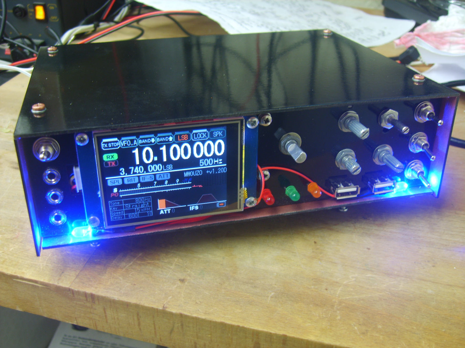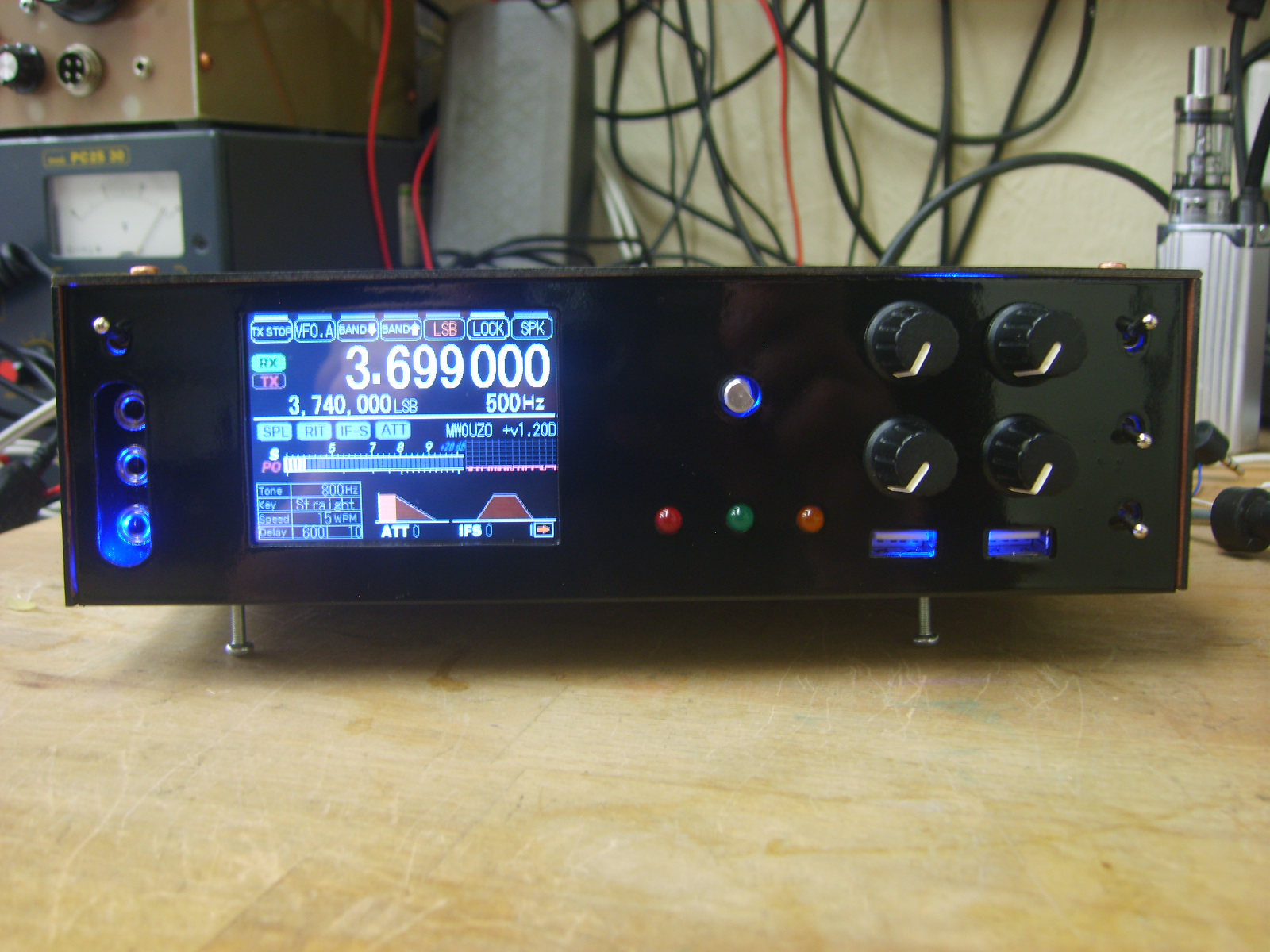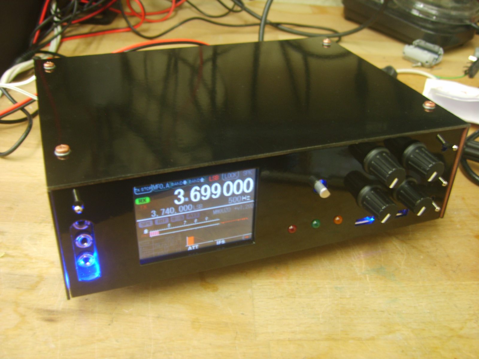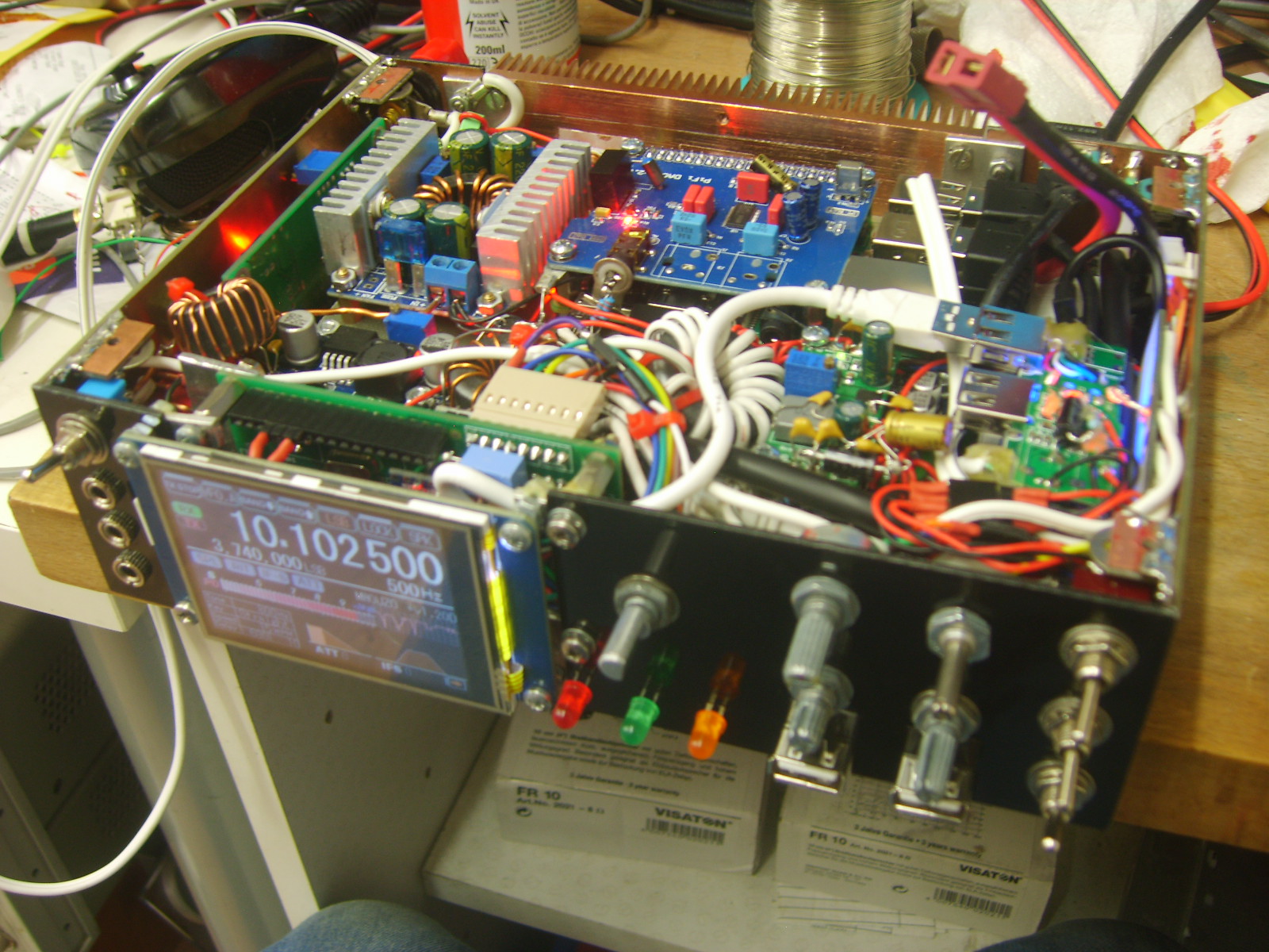 The small one at the front is a 5V types for the display, backlighting etc. The arduinos run from a linear 5V regulated supply on the Raduino board, due to psu noise being too high for the audio processing on the signal board. These supplies are mounted on a centrepiece of copper clad board, which shields the RF receiver sections from the switching supplies and the Raspberry Pi. Initially, as expected, I experienced some interference from the switchers and computer, however I was able to reduce the interfering signals to surprisingly low levels by including large RF chokes at the power inputs of each module, preventing stray RF hash from going back into the main power supply line. Pretty much all noise has been eliminated from the supplies, but the charging module seems to operate in quite a rough mode and generates sweeping noise which I have yet to completely eliminate, despite adding inductors and caps over it to try to eliminate the problem. While I continue to work on solving the problem, I can use the switch on the front to take the battery out of charge mode, which eliminates the noise.