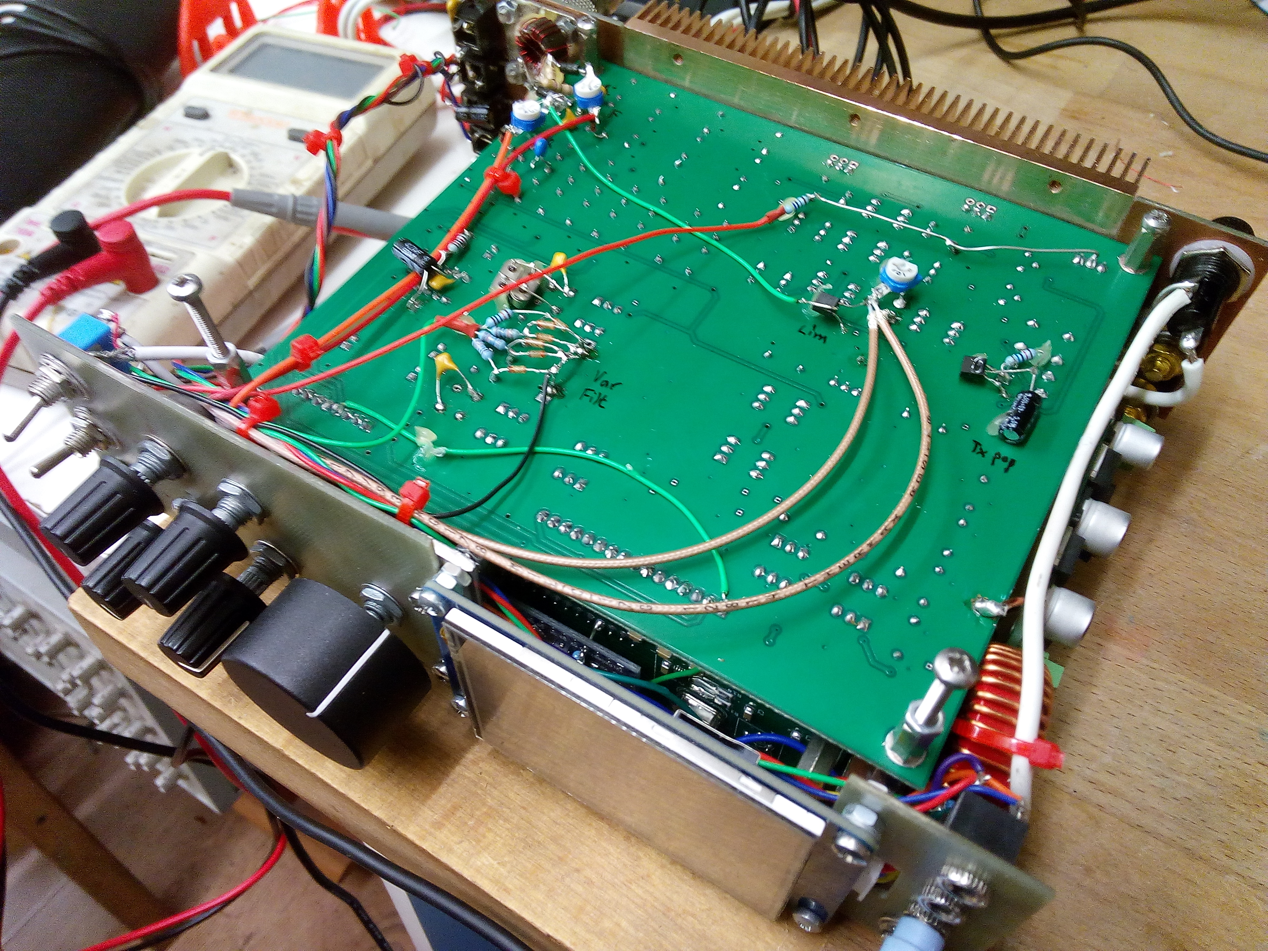 Some of the mods from left to right: SWR bridge, with forward and reverse voltage out trimpots. Anti-hiss LM386 mod. Variable filter bandwidth mod. It varies from about 1kHz wide to 3kHz wide. SWR protect and front panel drive control mod. RX to TX RF transient mod. PA mods: Upgraded inductors in PA+V line with thicker wire. Provided stouter PA +V feed with more wire. Audio mods: Replace 0.1uF caps in RX and TX audio amplifier with 22uF. Replace LM386 output capacitor with 330uF. Put 10uF across pins 1 and 8.