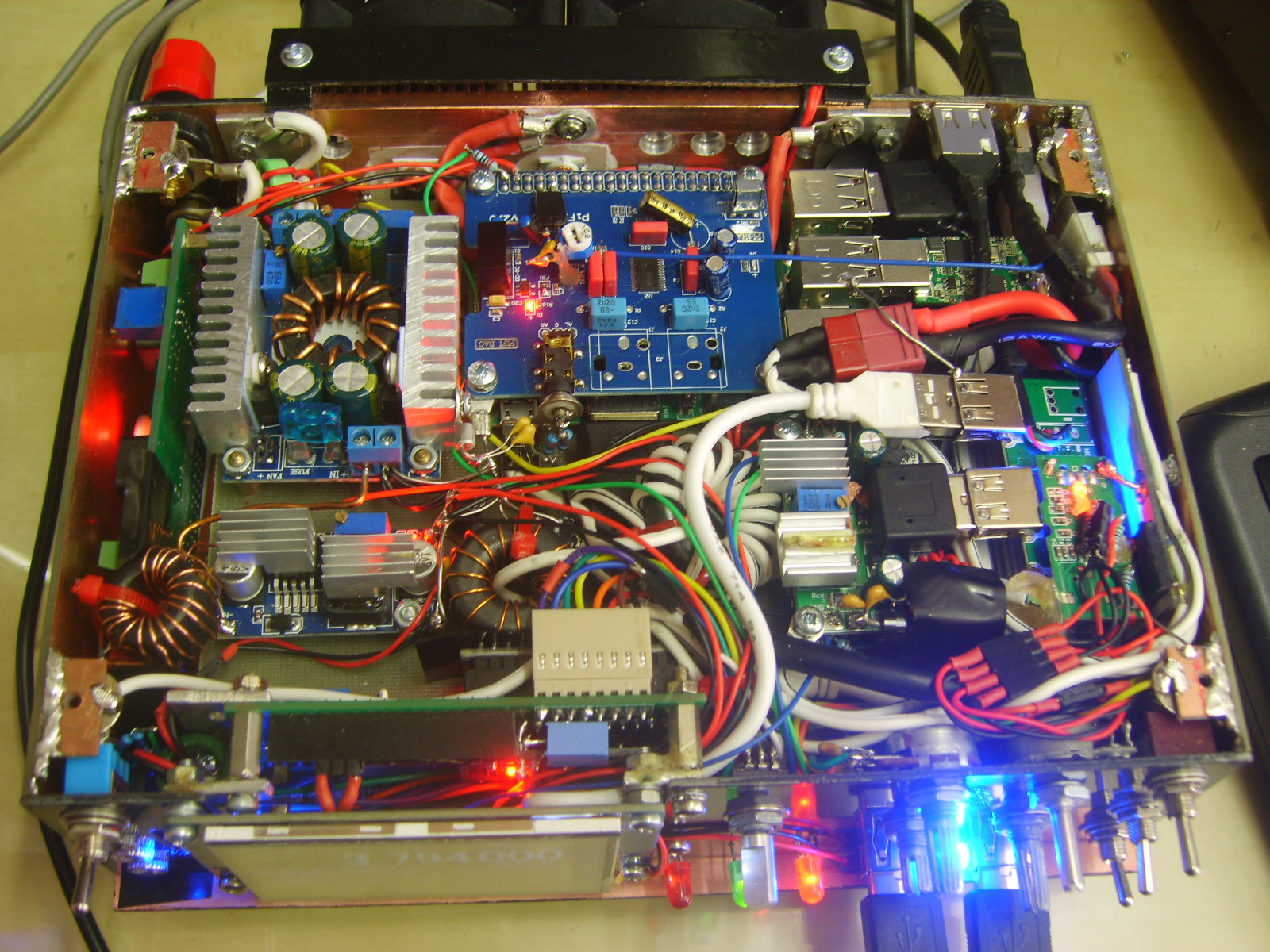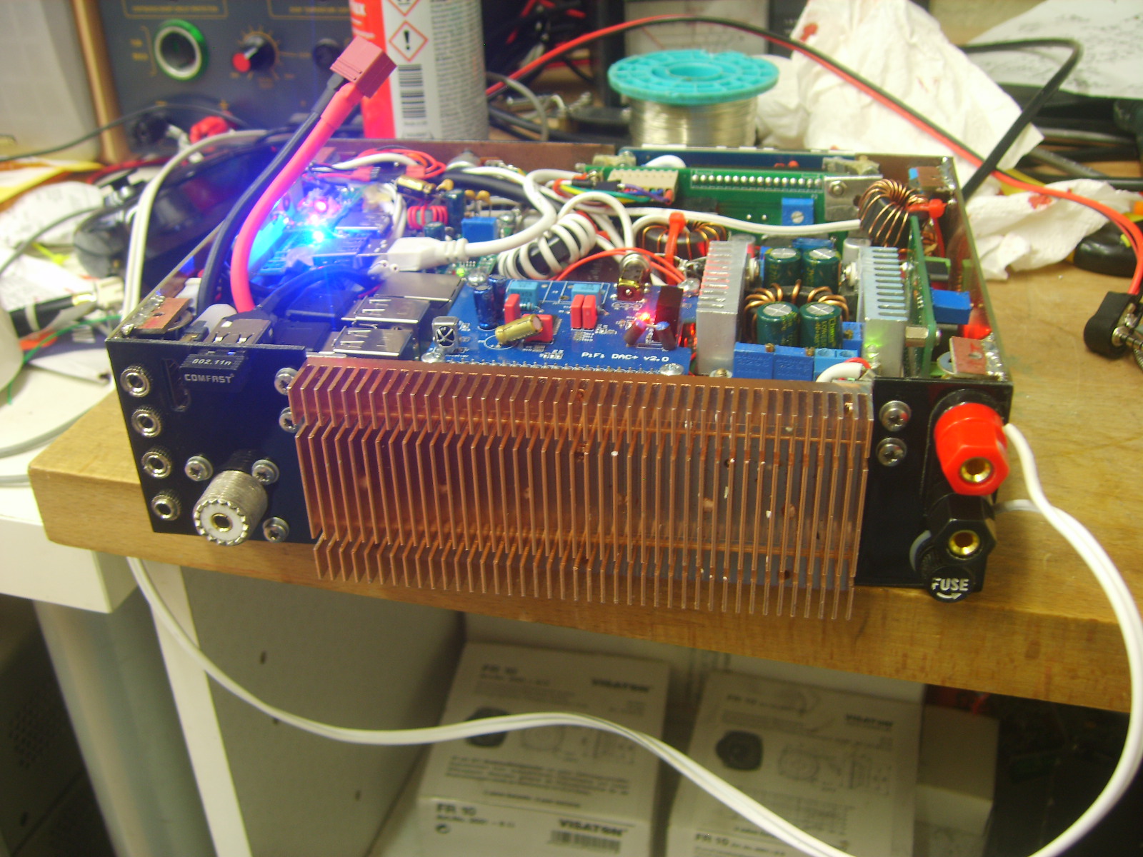 The square board with the heatsinks is the 24V supply for the PA, which can supply up to 8A, or 12A DC input. This also supplies the battery charge voltage.