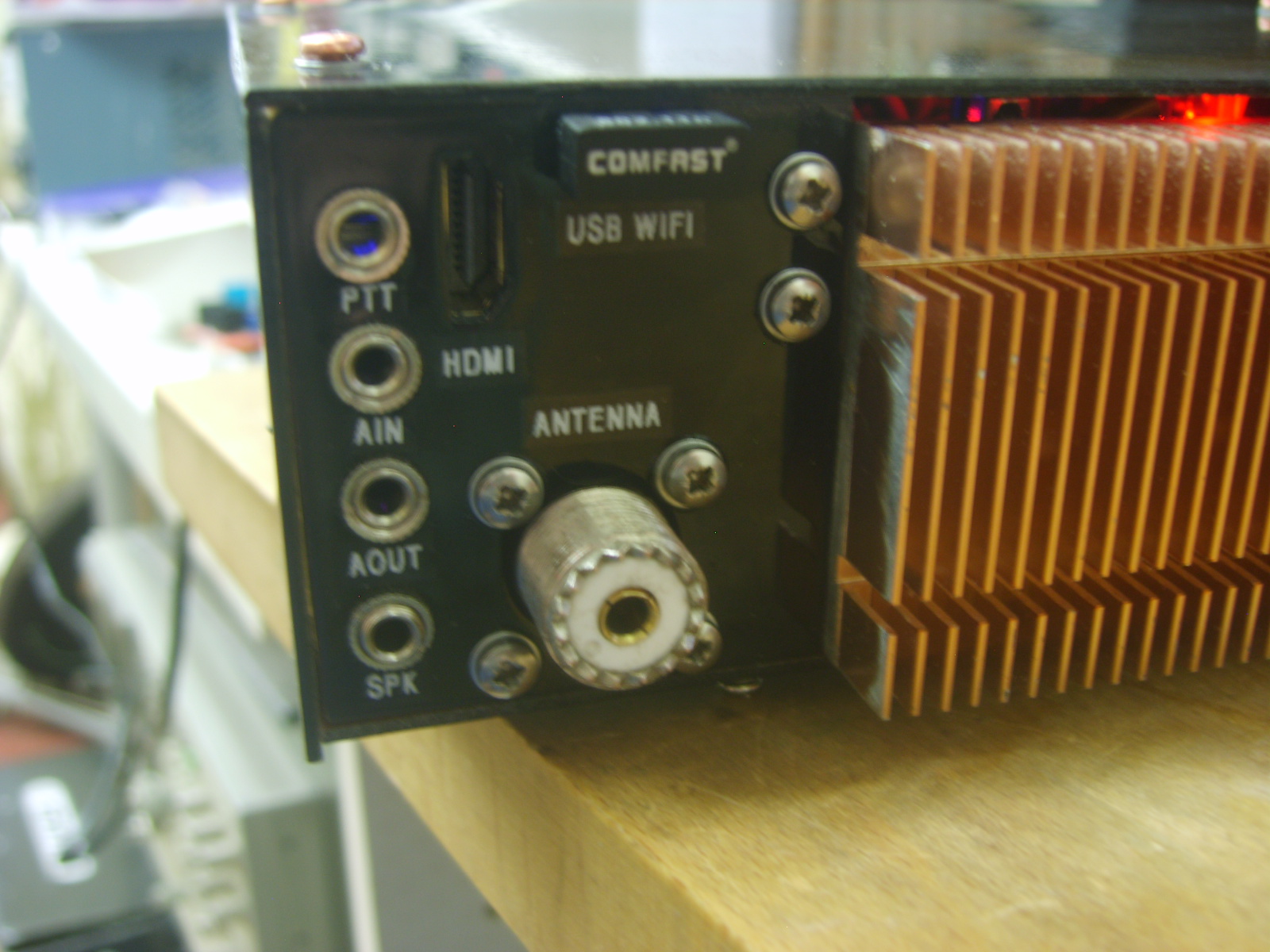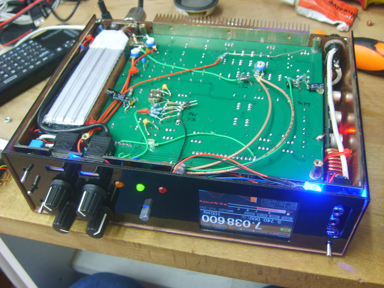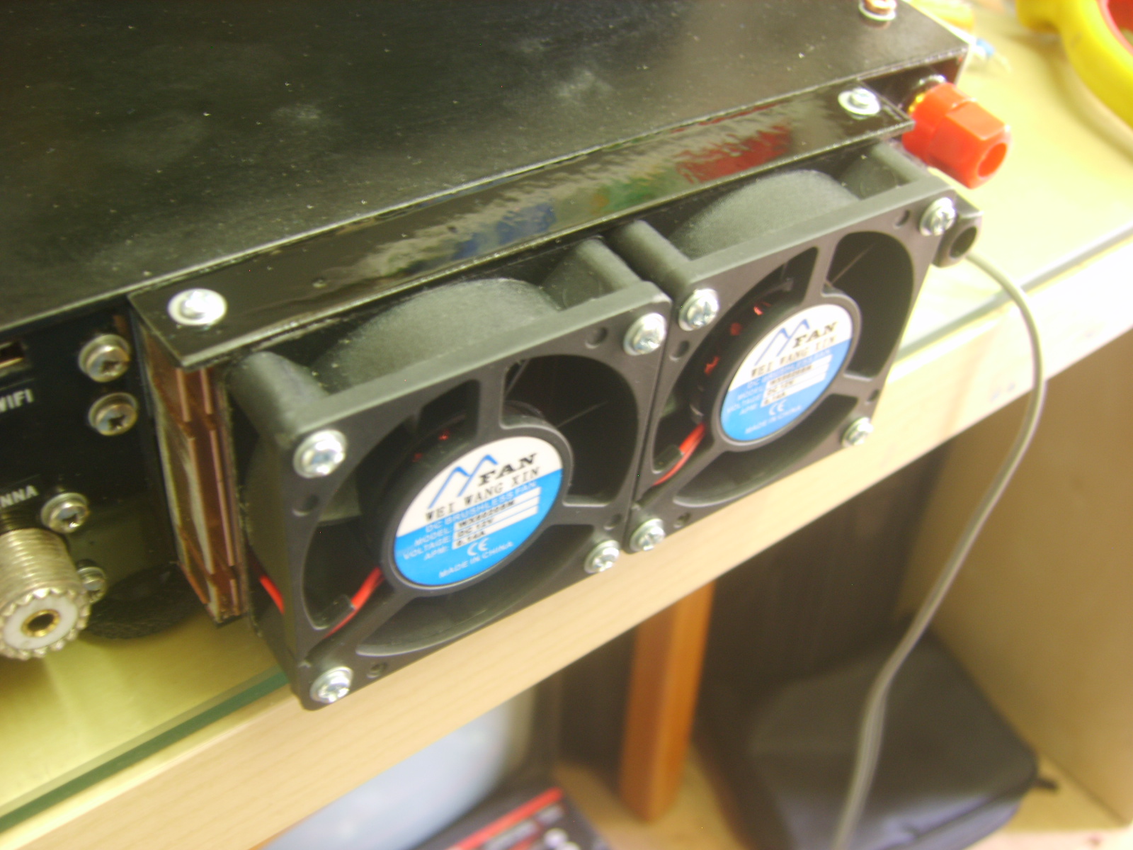 The extra depth from the fans is actually of no consequence, as the leads and connectors and wifi antenna are at least as deep as the heatsink/fan assembly. The fans run from the 5V supply when in RX and from around 9.5V on TX, using a 4.3v zener to drop some voltage from the 13.8V supply.  There is plenty of cooling now, really that's got to be a good thing considering the extra juice the stock LPFs and RF output transformers have to deal with.