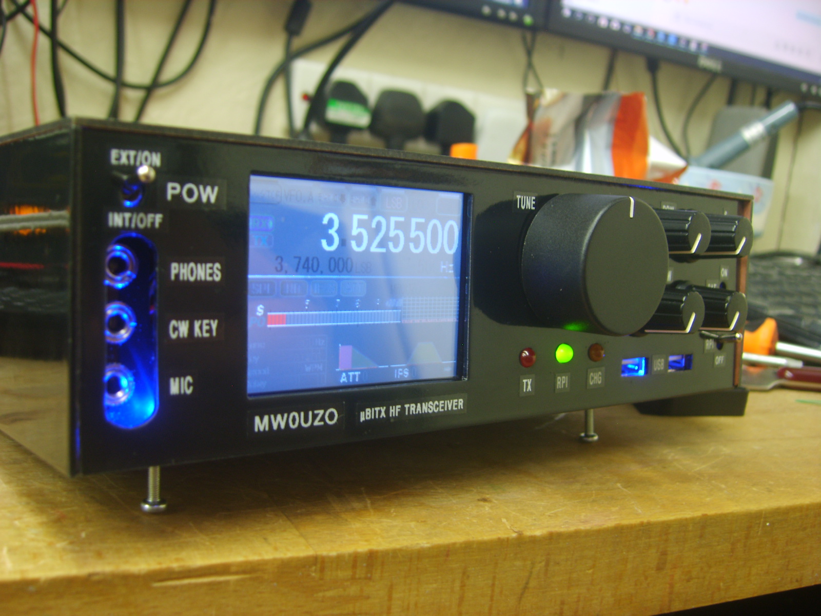 It's busy in there now! The SDR receiver has been fitted and works well set to 45Mhz. Also RPiTX has been plumbed into the IF at 11.0556Mhz and transmits! I removed two 11.055Mhz crystals from one side of the IF filter to solve an annoying interference problem (reason not clear). I used them in series on the output of RPiTX and the 45MHz IF on the uBitX provides some extra filtering necessary to tidy up the transmit signal.