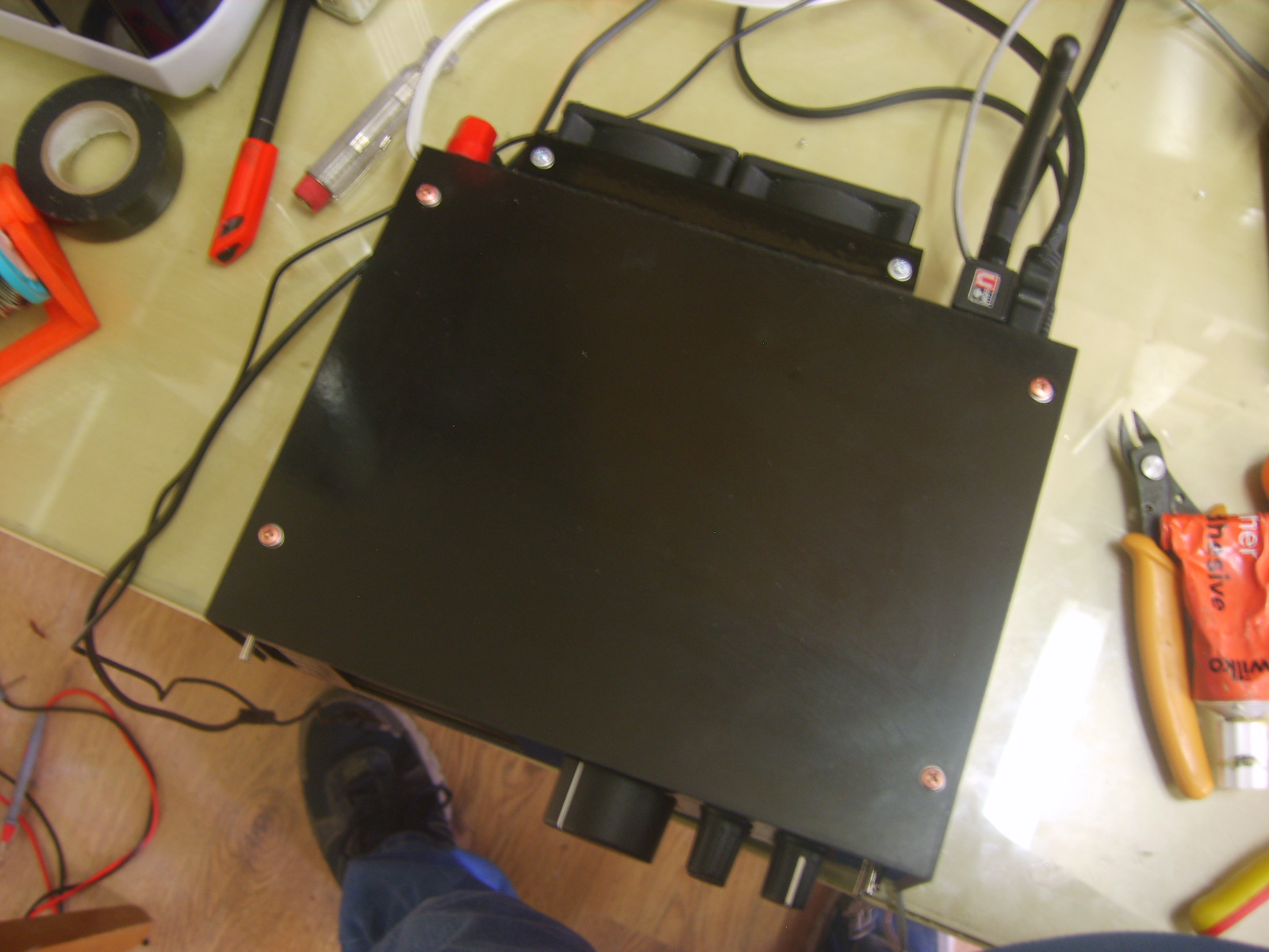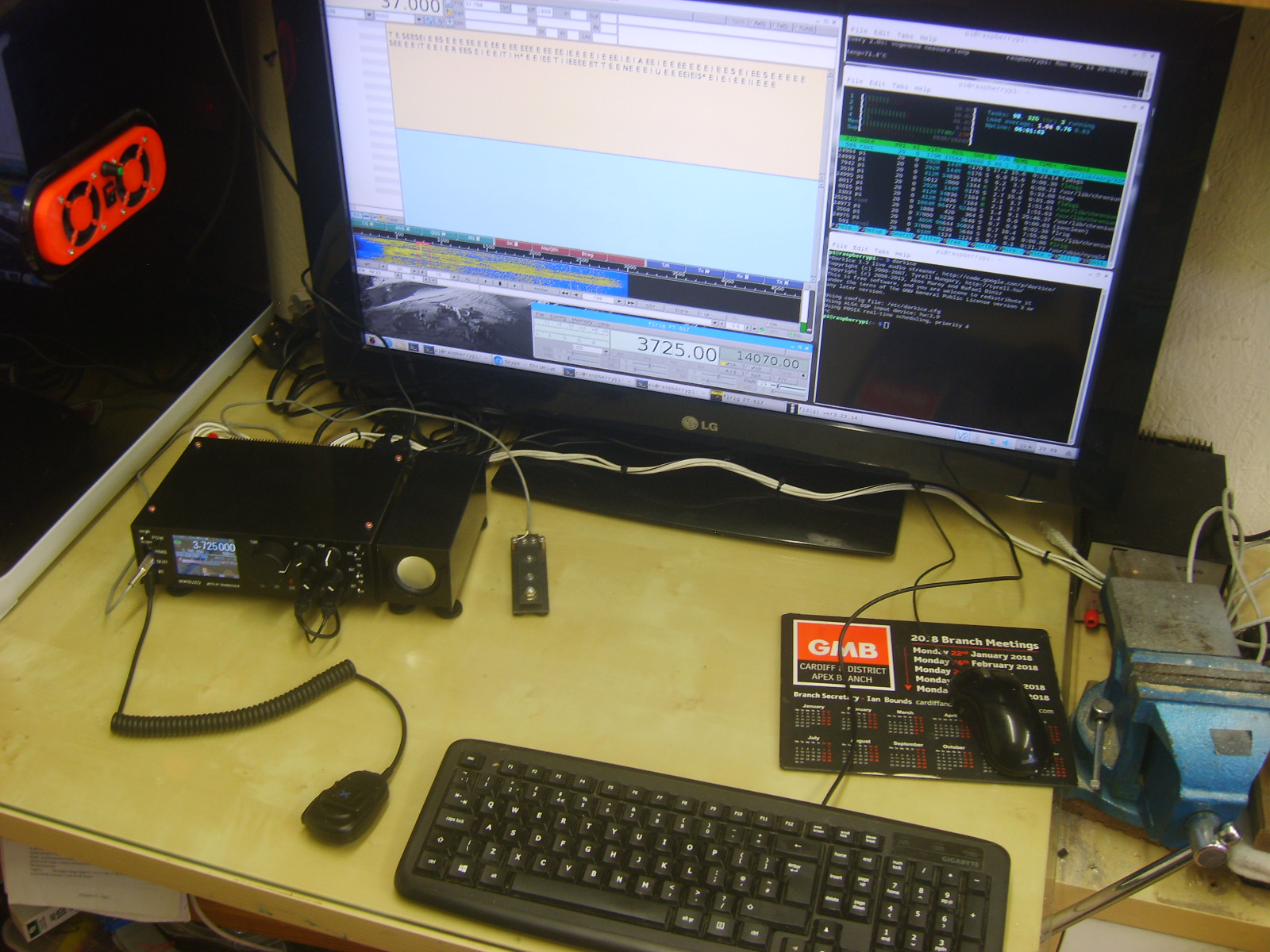 You may be looking at it and thinking - where's the cooling? Well I thought I'd try and get away with no fan, so it was completely silent. While it seemed to work fine on receive and transmit, internal temperatures were quite warm. Throw in the Pi crunching away hard and heat starts to build until eventually the CPU starts throttling. I fitted some copper braids that led off to the rear heatsink, which stopped the throttling. The reason for holding off fitting a fan was that I thought I would have to fit a 40mm fan in the case above the 5v power supply - the only place it would fit - and that it would be whiny and horrible. It took a week or two of knowing that it needs cooling and thinking about it before I realised that a solution exists that could use larger fans and no whine and no need to cut the case either.