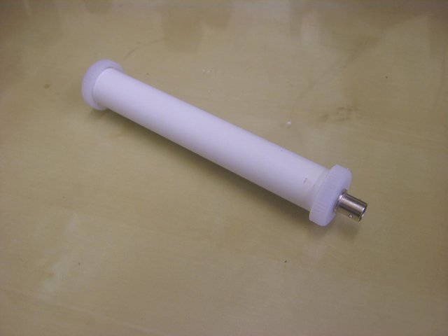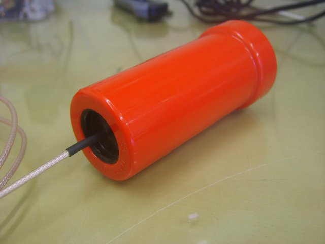 A pancake proble detector wand was made from a plastic wine bottle corking device, available in homebrew shops. It was the ideal size to contain an Si-15BG pancake geiger tube. A rubber grommet was epoxied into the back of the wand to provide the cable exit. A discarded aluminium volume control knob was used as a cap.