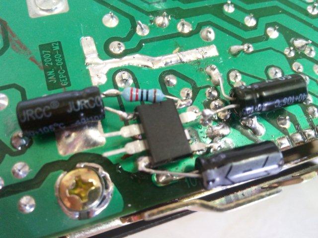7) Solder a 1uF capacitor from ground to pin 7 on the LM386. Capacitor - towards ground. This capacitor is required for stability. This is the capacitor on the right hand side in the photo.