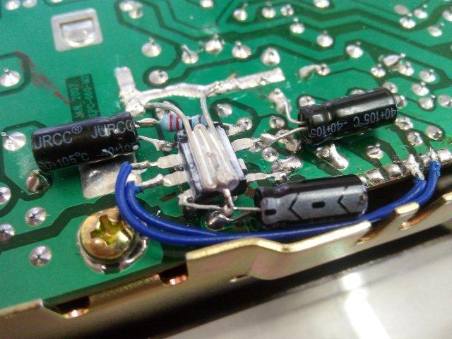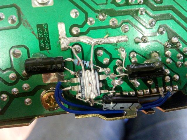 1) Unsolder the speaker wires. Desolder and remove the duff YD1022 if you haven't already. Throw it in the bin with anger and hatred. Put some solder back on the audio IC pads. Clean up the board with IPA and cotton bud. Note the order of the pins, on my board it is stamped 1 and 10 on each side. If yours isn't marked, with the knobs on the right and the underside of the pcb facing you, pin 1 is on the right hand side.